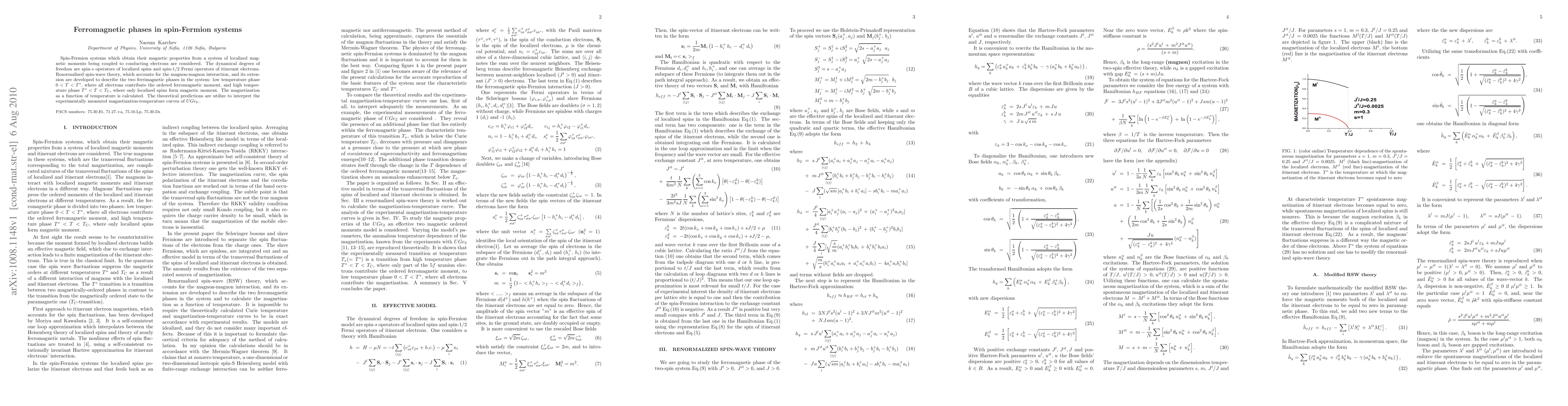 This paper develops renormalized spin-wave theory to describe ferromagnetic phases in spin-Fermion systems, identifying two ferrimagnetic phases and calculating their magnetization as a function of temperature. The theoretical predictions are applied to interpret the magnetization-temperature curves of $UGe_2$.
