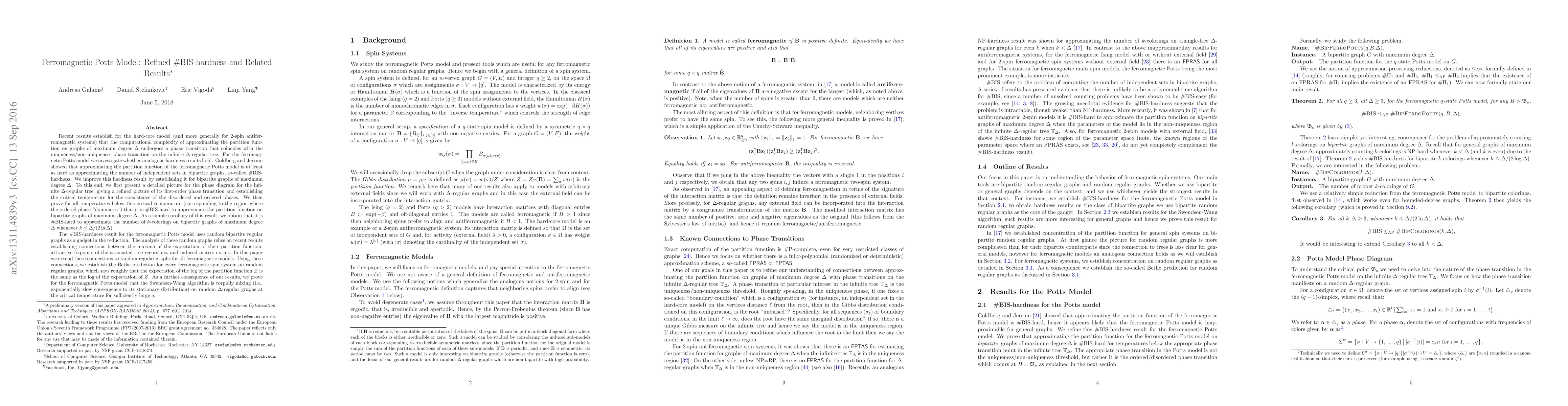 This paper refines the #BIS-hardness results for the ferromagnetic Potts model, showing that approximating its partition function on bipartite graphs of maximum degree D is at least as hard as approximating the number of independent sets. It establishes a detailed phase diagram for the infinite D-regular tree and proves #BIS-hardness for all temperatures below the critical temperature, extending recent connections between random bipartite graphs and ferromagnetic spin systems.
