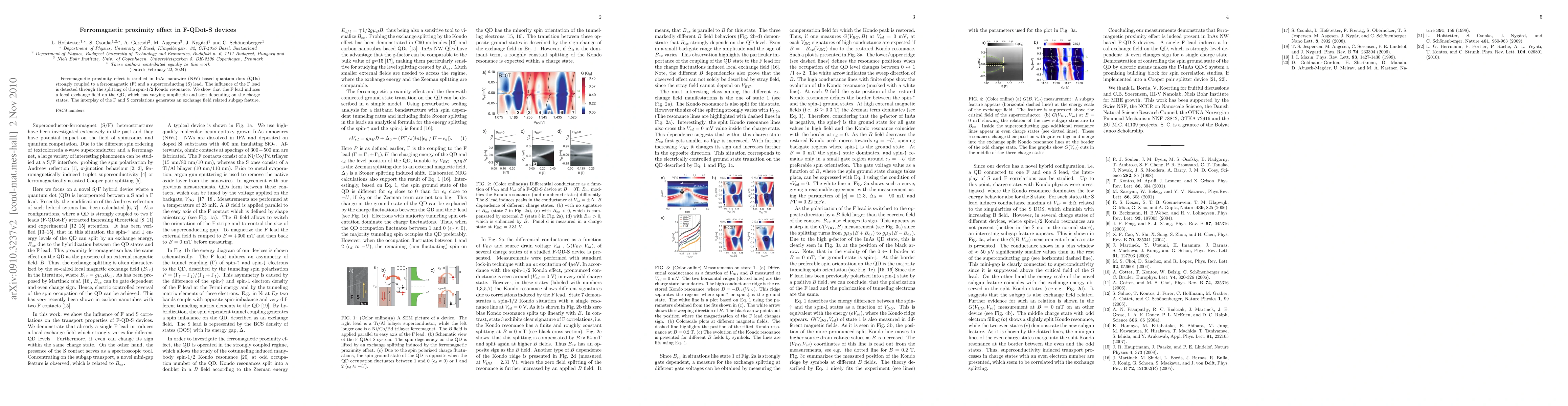 Ferromagnetic proximity effect is studied in InAs nanowire (NW) based quantum dots (QD) strongly coupled to a ferromagnetic (F) and a superconducting (S) lead. The influence of the F lead is detected through the splitting of the spin-1/2 Kondo resonance. We show that the F lead induces a local exchange field on the QD, which has varying amplitude and a sign depending on the charge states. The interplay of the F and S correlations generates an exchange field related supgap feature. This novel mini-gap allows now the visualization of the exchange field also in even charge states