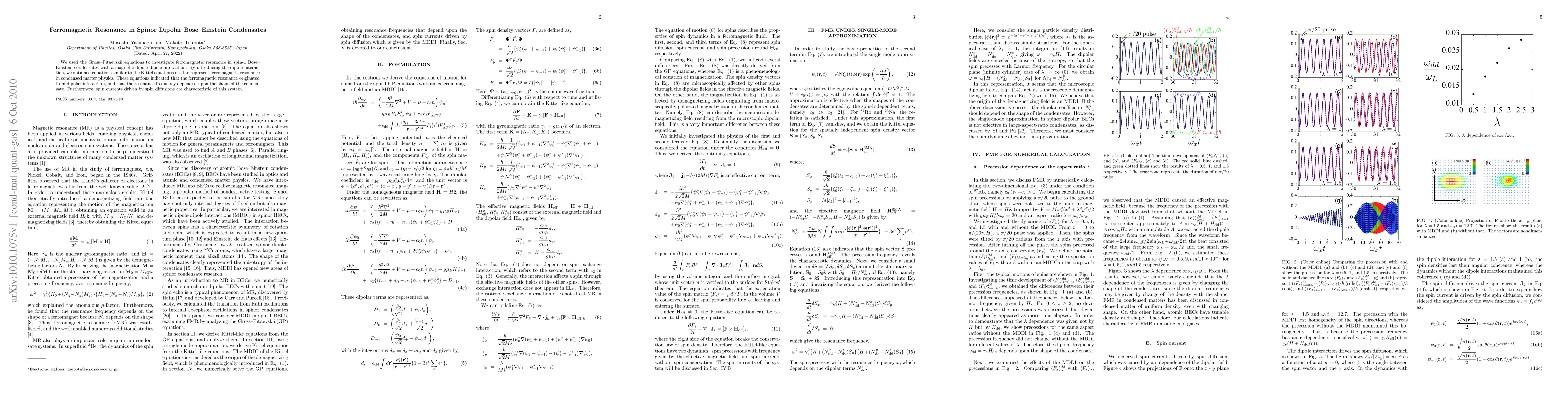 We used the Gross--Pitaevskii equations to investigate ferromagnetic resonance in spin-1 Bose--Einstein condensates with a magnetic dipole-dipole interaction. By introducing the dipole interaction, we obtained equations similar to the Kittel equations used to represent ferromagnetic resonance in condensed matter physics. These equations indicated that the ferromagnetic resonance originated from dipolar interaction, and that the resonance frequency depended upon the shape of the condensate. Furthermore, spin currents driven by spin diffusions are characteristic of this system.