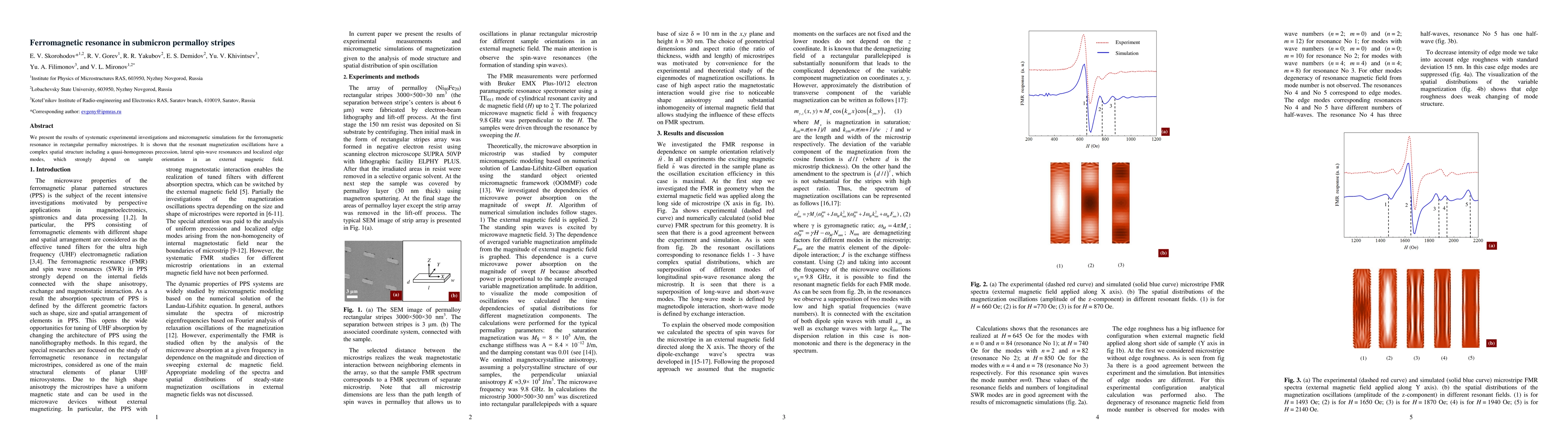 We present the results of systematic experimental investigations and micromagnetic simulations for the ferromagnetic resonance in rectangular permalloy microstripes. It is shown that the resonant magnetization oscillations have a complex spatial structure including a quasi-homogeneous precession, lateral spin-wave resonances and localized edge modes, which strongly depend on sample orientation in an external magnetic field.