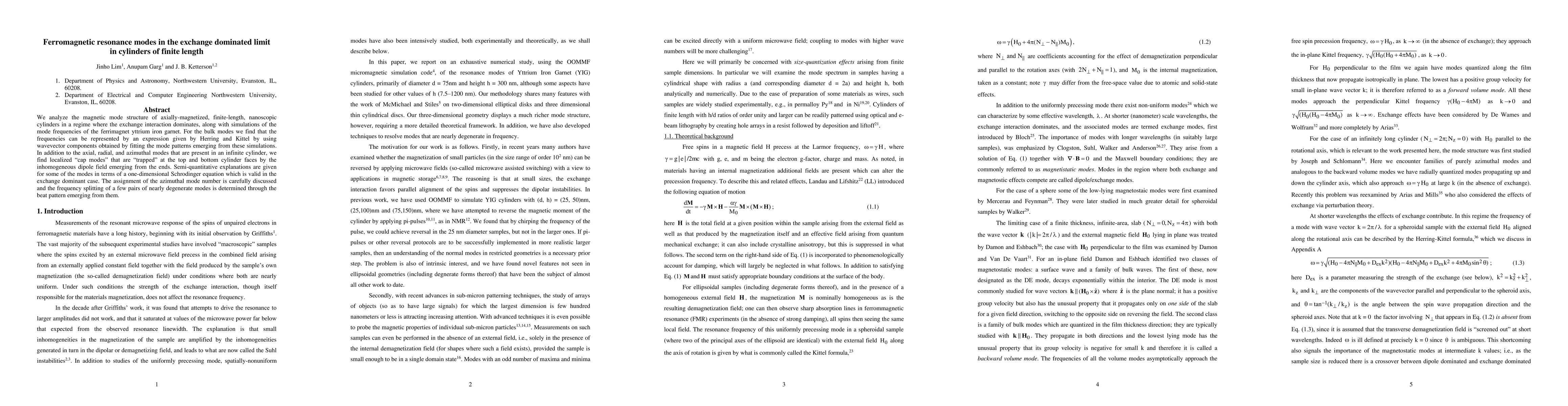 Researchers studied ferromagnetic resonance modes in short, thin cylinders where exchange interaction dominates, finding localized 'cap modes' that emerge from the ends of the cylinder and a frequency splitting pattern among some nearly degenerate modes.