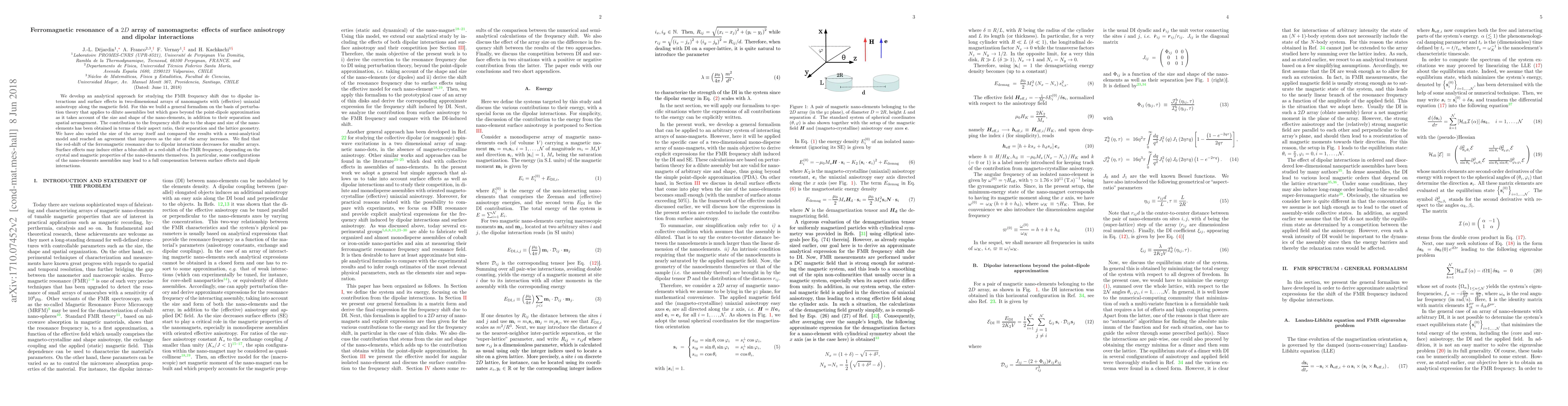This paper develops an analytical approach to study the ferromagnetic resonance frequency shift in two-dimensional nanomagnet arrays, considering both dipolar interactions and surface anisotropy effects. The model accounts for the size, shape, and arrangement of nanomagnets, revealing that smaller arrays experience a reduced red-shift in FMR frequency due to dipolar interactions, while surface effects can induce shifts depending on the nanomagnet's properties.