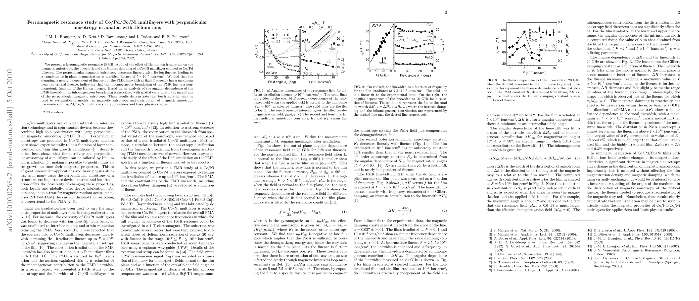 The paper presents a detailed FMR study of Co/Pd/Co/Ni multilayers under Helium ion irradiation, providing insights into the relationship between ion fluence, magnetic anisotropy, linewidth, and Gilbert damping.