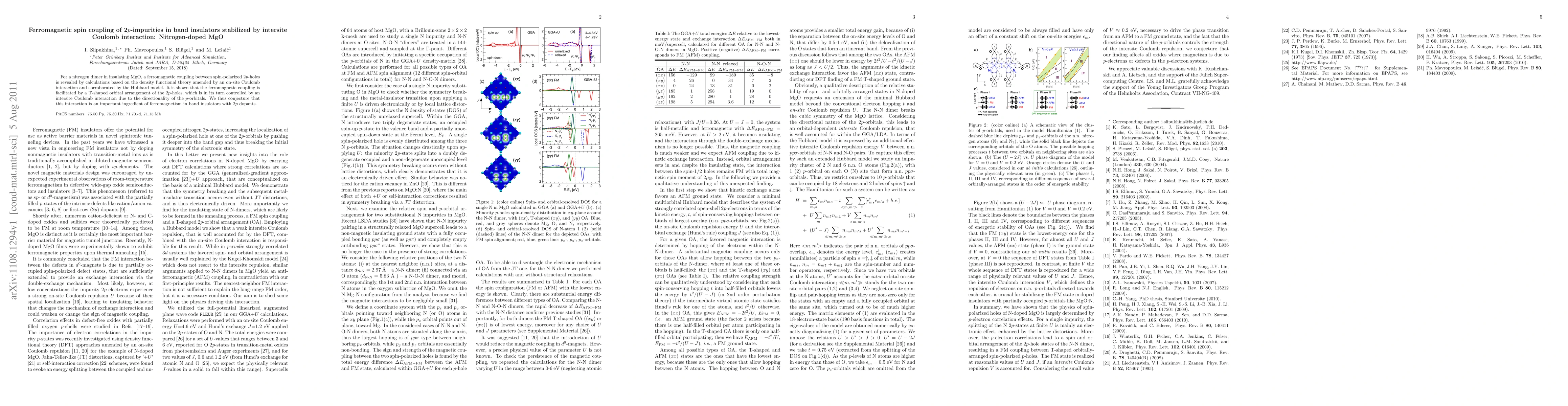 For a nitrogen dimer in insulating MgO, a ferromagnetic coupling between spin-polarized $2p$-holes is revealed by calculations based on the density functional theory amended by an on-site Coulomb interaction and corroborated by the Hubbard model. It is shown that the ferromagnetic coupling is facilitated by a T-shaped orbital arrangement of the $2p$-holes, which is in its turn controlled by an intersite Coulomb interaction due to the directionality of the $p$-orbitals. We thus conjecture that this interaction is an important ingredient of ferromagnetism in band insulators with $2p$ dopants.