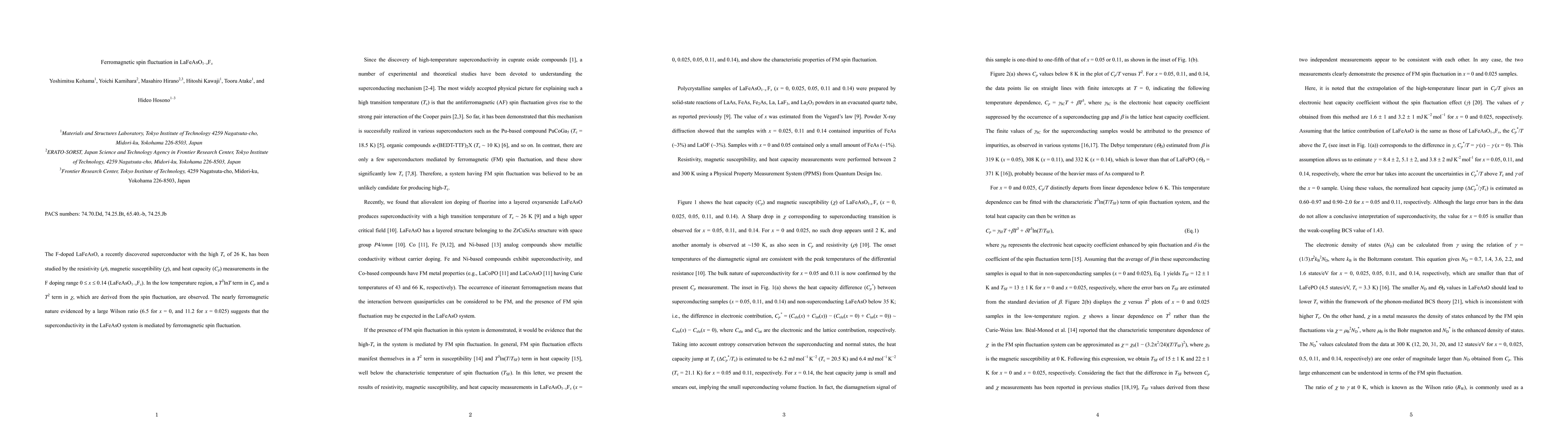 This study investigates the ferromagnetic spin fluctuations in F-doped LaFeAsO superconductors, revealing a T3lnT term in heat capacity and a T2 term in magnetic susceptibility indicative of spin fluctuations. The large Wilson ratio suggests that superconductivity in this system is mediated by ferromagnetic spin fluctuations.