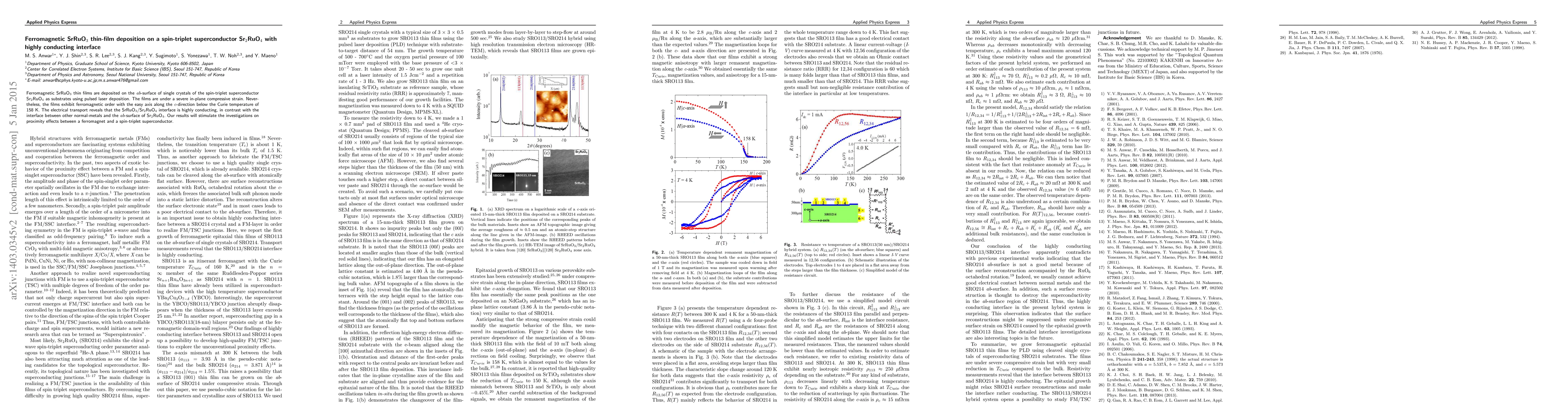 Ferromagnetic SrRuO3 thin films deposited on spin-triplet superconductor Sr2RuO4 show ferromagnetic order despite compressive strain, and the SrRuO3/Sr2RuO4 interface exhibits high conductivity, contrasting with other metal interfaces.