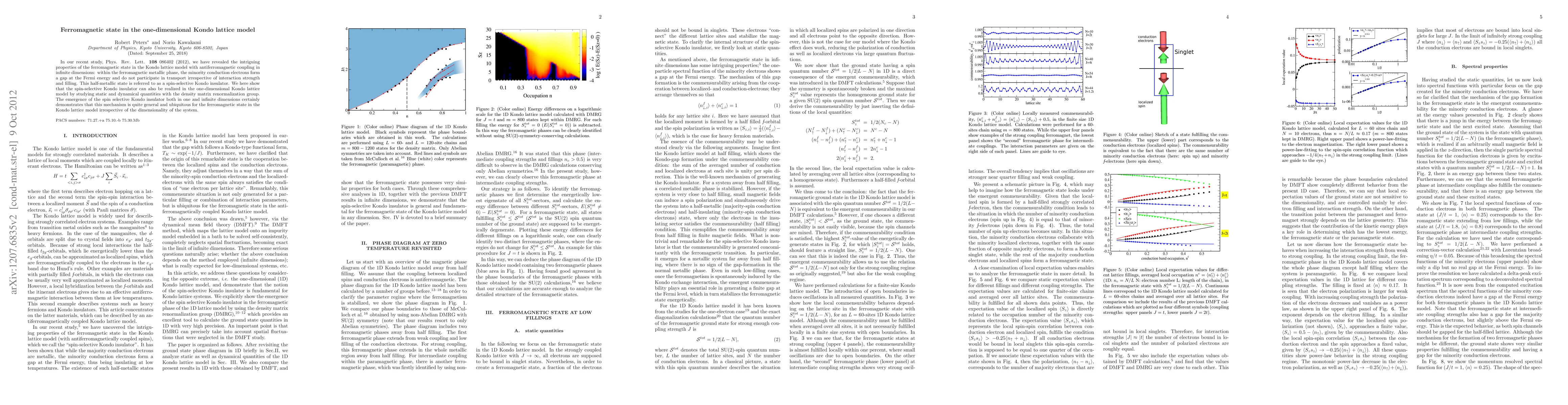 In our recent study, Phys. Rev. Lett. 108 086402 (2012), we have revealed the intriguing properties of the ferromagnetic state in the Kondo lattice model with antiferromagnetic coupling in infinite dimensions: within the ferromagnetic metallic phase, the minority conduction electrons form a gap at the Fermi energy and do not participate in transport irrespective of interaction strength and filling. This half-metallic state is referred to as a spin-selective Kondo insulator. We here show that the spin-selective Kondo insulator can also be realized in the one-dimensional Kondo lattice model by studying static and dynamical quantities with the density matrix renormalization group. The emergence of the spin selective Kondo insulator both in one and infinite dimensions certainly demonstrates that this mechanism is quite general and ubiquitous for the ferromagnetic state in the Kondo lattice model irrespective of the dimensionality of the system.