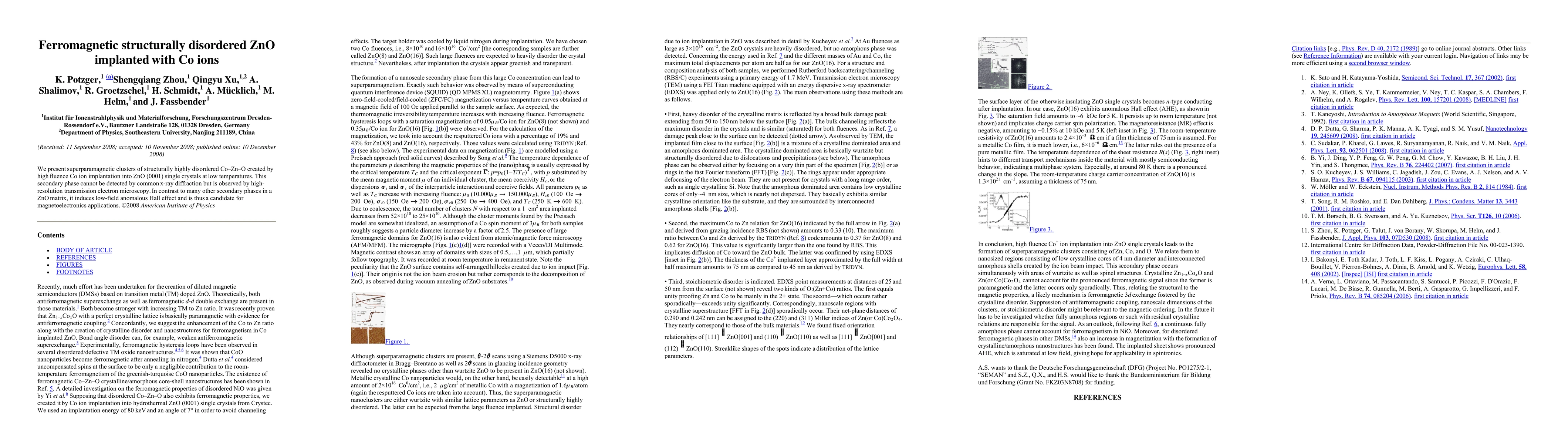 We present superparamagnetic clusters of structurally highly disordered Co-Zn-O created by high fluence Co ion implantation into ZnO (0001) single crystals at low temperatures. This secondary phase cannot be detected by common x-ray diffraction but is observed by high-resolution transmission electron microscopy. In contrast to many other secondary phases in a ZnO matrix it induces low-field anomalous Hall effect and thus is a candidate for magneto-electronics applications.