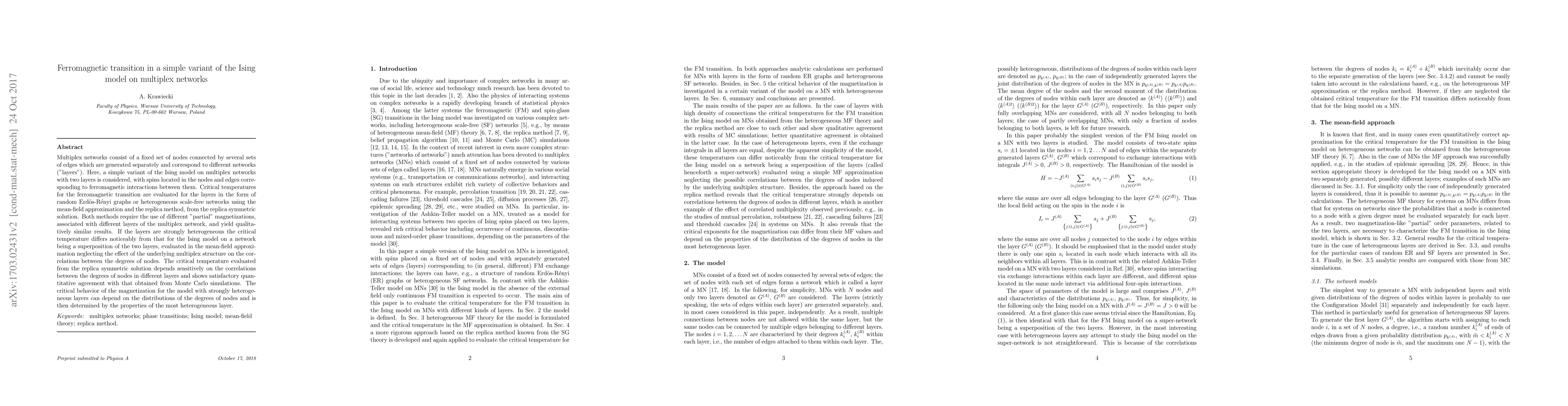 This paper investigates the ferromagnetic transition in a variant of the Ising model on multiplex networks, specifically two-layer networks. Critical temperatures are evaluated using mean-field approximation and the replica method, showing that the critical temperature varies significantly depending on the heterogeneity of the layers and the correlations between node degrees.
