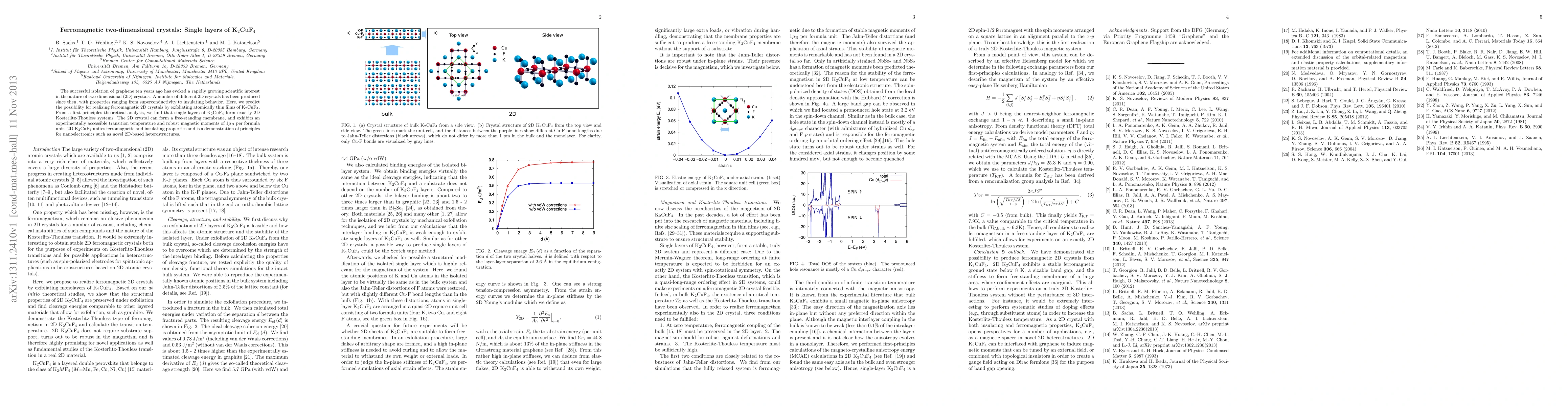 The paper predicts the feasibility of creating ferromagnetic 2D crystals from K2CuF4, demonstrating through first-principles analysis that single layers of K2CuF4 form stable 2D systems with an accessible transition temperature and robust magnetic moments. These 2D K2CuF4 crystals combine ferromagnetic and insulating properties, potentially paving the way for advancements in 2D-based nanoelectronics and heterostructures.