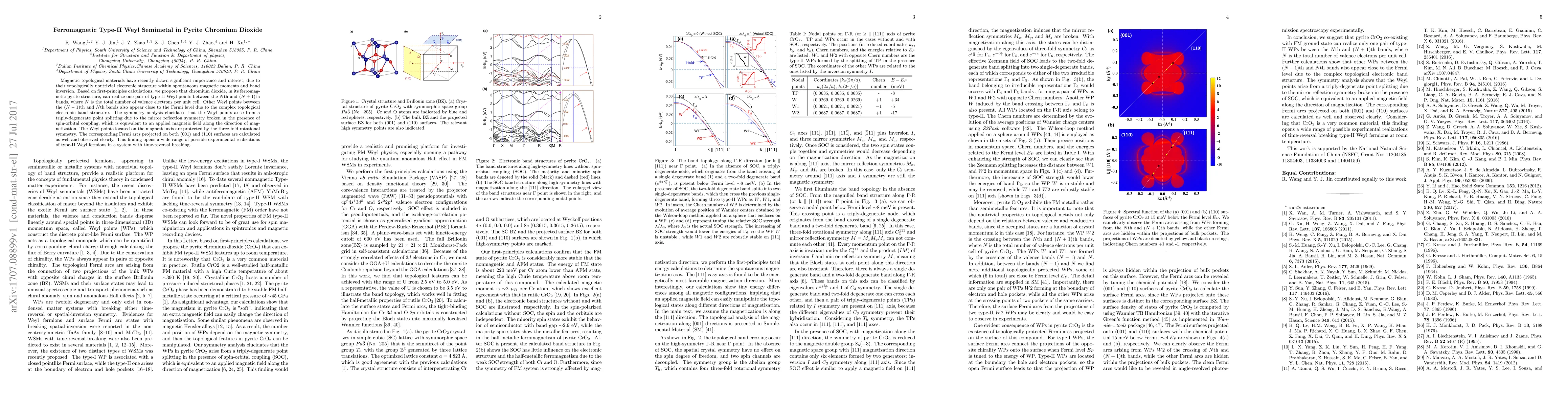 Magnetic topological materials have recently drawn significant importance and interest, due to their topologically nontrivial electronic structure within spontaneous magnetic moments and band inversion. Based on first-principles calculations, we propose that chromium dioxide, in its ferromagnetic pyrite structure, can realize one pair of type-II Weyl points between the $N$th and $(N+1)$th bands, where $N$ is the total number of valence electrons per unit cell. Other Weyl points between the $(N-1)$th and $N$th bands also appear close to the Fermi level due to the complex topological electronic band structure. The symmetry analysis elucidates that the Weyl points arise from a triply-degenerate point splitting due to the mirror reflection symmetry broken in the presence of spin-orbital coupling, which is equivalent to an applied magnetic field along the direction of magnetization. The Weyl points located on the magnetic axis are protected by the three-fold rotational symmetry. The corresponding Fermi arcs projected on both (001) and (110) surfaces are calculated as well and observed clearly. This finding opens a wide range of possible experimental realizations of type-II Weyl fermions in a system with time-reversal breaking.