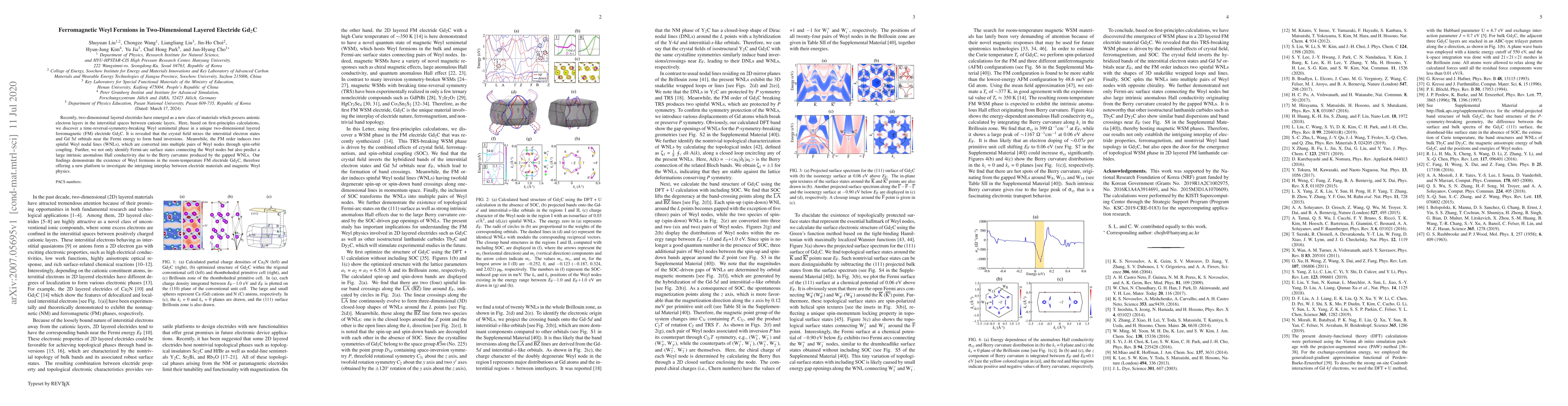This paper discovers a ferromagnetic Weyl semimetal phase in the two-dimensional layered electride Gd$_2$C, showing band inversions and spinful Weyl nodal lines, with Fermi-arc surface states and a large intrinsic anomalous Hall conductivity predicted. This identifies a new platform for studying the interplay between electride materials and magnetic Weyl physics.
