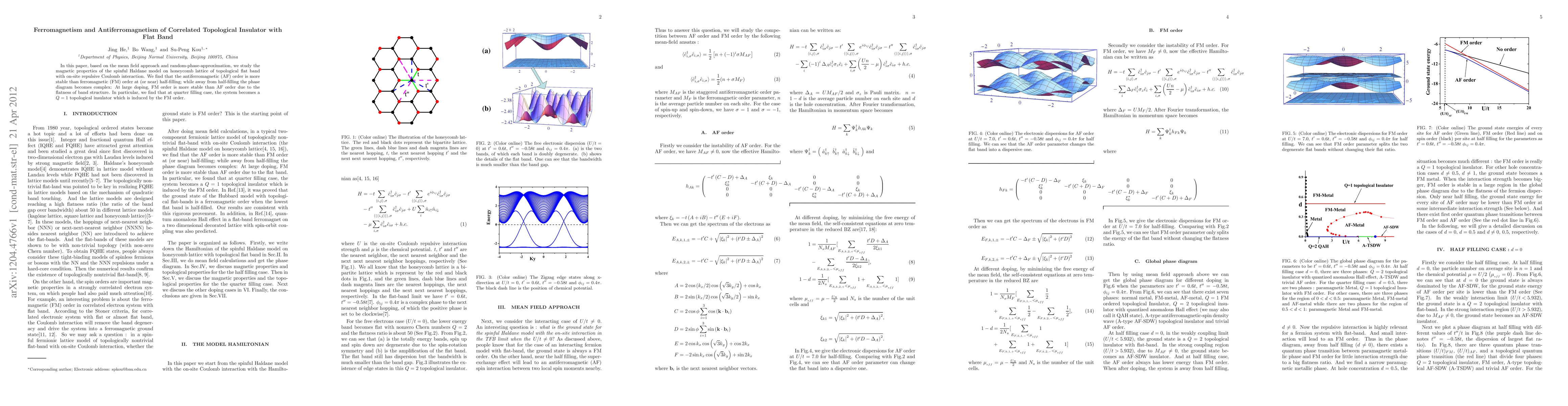This paper investigates the magnetic properties of the spinful Haldane model on a honeycomb lattice with topological flat bands and on-site Coulomb interaction. It finds that antiferromagnetic order is more stable near half-filling, while ferromagnetic order becomes stable at large doping due to the flat band structure, leading to a Q=1 topological insulator at quarter filling.