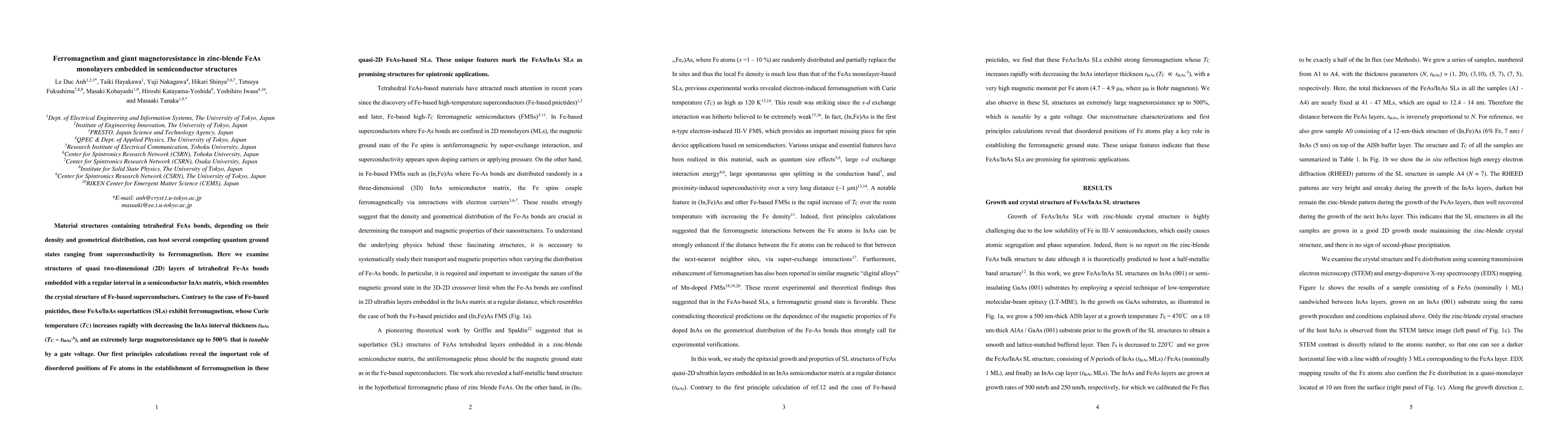 This study investigates quasi-2D FeAs layers embedded in InAs semiconductor matrices, revealing ferromagnetism and giant magnetoresistance tunable by gate voltage. The Curie temperature increases significantly with thinner InAs layers, highlighting potential for spintronic applications.
