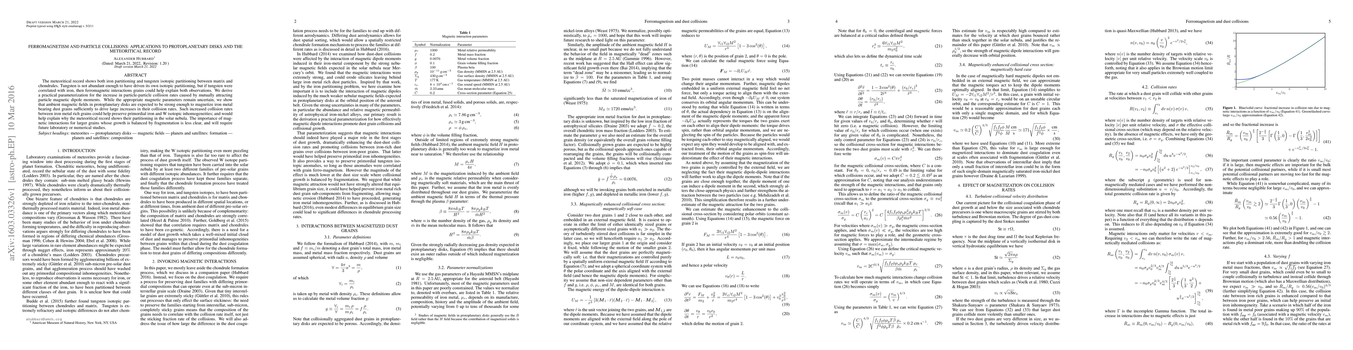 This paper explores how ferromagnetism in iron-rich grains can enhance particle collision rates in protoplanetary disks, potentially explaining the observed partitioning of iron and tungsten isotopes in meteorites. It proposes a model for the increased collision rates due to magnetic dipole interactions and suggests that strong ambient magnetic fields could sufficiently magnetize these grains.