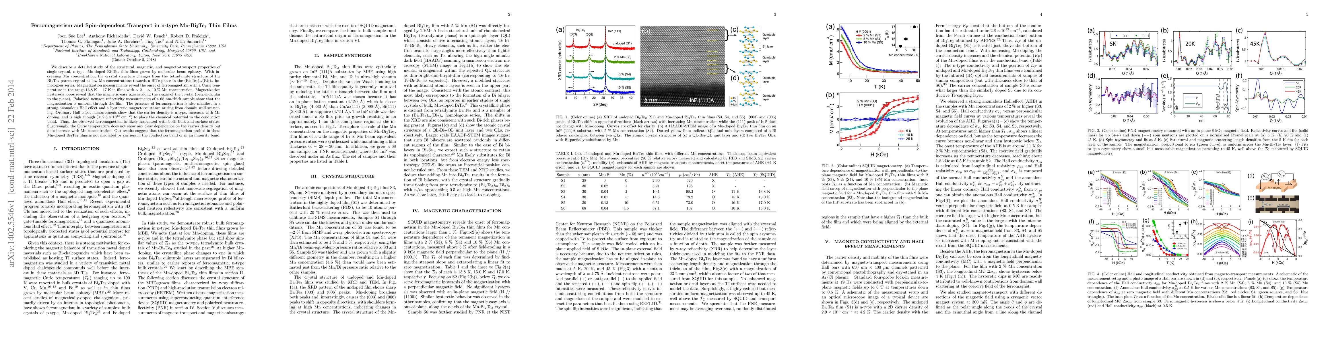 We describe a detailed study of the structural, magnetic, and magneto-transport properties of single-crystal, n-type, Mn-doped Bi2Te3 thin films grown by molecular beam epitaxy. With increasing Mn concentration, the crystal structure changes from the tetradymite structure of the Bi2Te3 parent crystal at low Mn concentrations towards a BiTe phase in the (Bi2Te3)m(Bi2)n homologous series. Magnetization measurements reveal the onset of ferromagnetism with a Curie temperature in the range 13.8 K - 17 K in films with 2 % - 10 % Mn concentration. Magnetization hysteresis loops reveal that the magnetic easy axis is along the c-axis of the crystal (perpendicular to the plane). Polarized neutron reflectivity measurements of a 68 nm-thick sample show that the magnetization is uniform through the film. The presence of ferromagnetism is also manifest in a strong anomalous Hall effect and a hysteretic magnetoresistance arising from domain wall scattering. Ordinary Hall effect measurements show that the carrier density is n-type, increases with Mn doping, and is high enough (> 2.8 x 10^{13} cm^{-2}) to place the chemical potential in the conduction band. Thus, the observed ferromagnetism is likely associated with both bulk and surface states. Surprisingly, the Curie temperature does not show any clear dependence on the carrier density but does increase with Mn concentration. Our results suggest that the ferromagnetism probed in these Mn-doped Bi2Te3 films is not mediated by carriers in the conduction band or in an impurity band.
