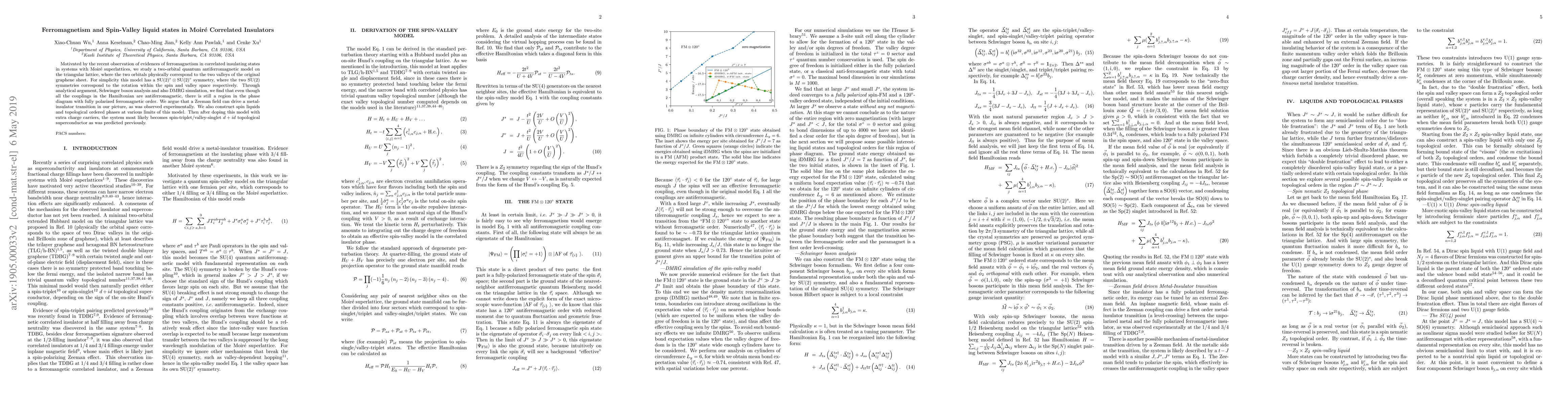 Motivated by the recent observation of evidences of ferromagnetism in correlated insulating states in systems with Moir\'{e} superlattices, we study a two-orbital quantum antiferromagnetic model on the triangular lattice, where the two orbitals physically correspond to the two valleys of the original graphene sheet. For simplicity this model has a SU(2)$^s$$\otimes$SU(2)$^v$ symmetry, where the two SU(2) symmetries correspond to the rotation within the spin and valley space respectively. Through analytical argument, Schwinger boson analysis and also DMRG simulation, we find that even though all the couplings in the Hamiltonian are antiferromagnetic, there is still a region in the phase diagram with fully polarized ferromagnetic order. We argue that a Zeeman field can drive a metal-insulator transition in our picture, as was observed experimentally. We also construct spin liquids and topological ordered phases at various limits of this model. Then after doping this model with extra charge carriers, the system most likely becomes spin-triplet/valley-singlet $d+id$ topological superconductor as was predicted previously.