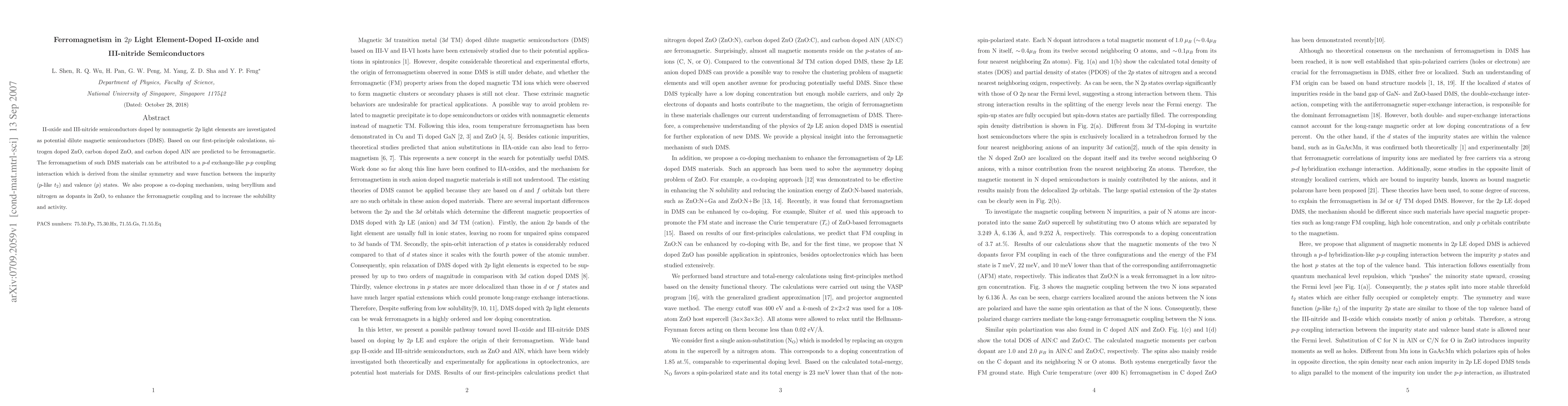 This study investigates ferromagnetism in II-oxide and III-nitride semiconductors doped with nonmagnetic 2p light elements, predicting ferromagnetism in nitrogen-doped ZnO, carbon-doped ZnO, and carbon-doped AlN due to p-p coupling interactions. A co-doping mechanism using beryllium and nitrogen in ZnO is proposed to enhance ferromagnetism and improve material properties.