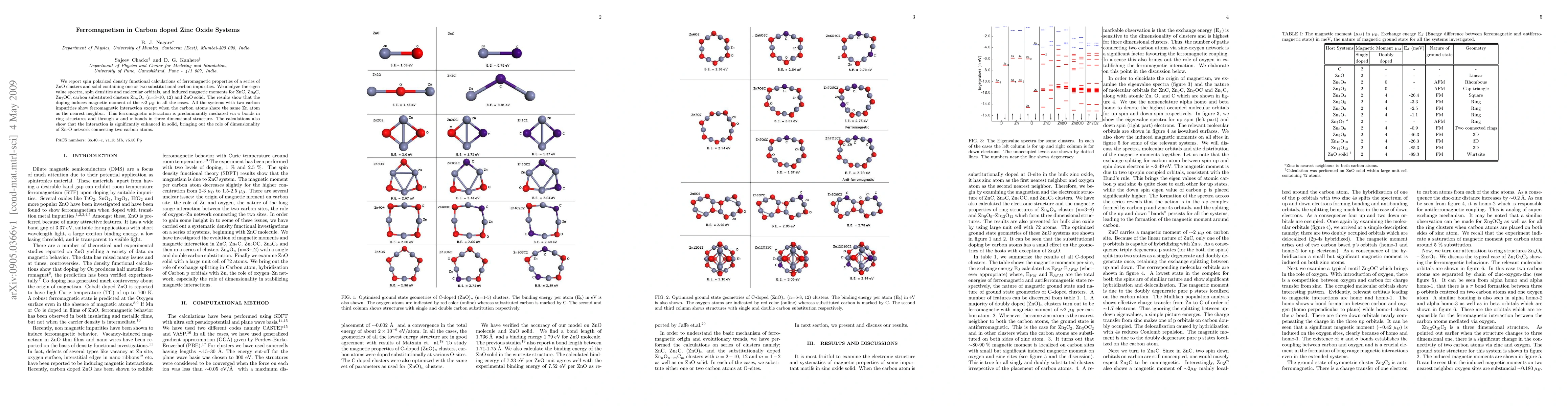 We report spin polarized density functional calculations of ferromagnetic properties of a series of ZnO clusters and solid containing one or two substitutional carbon impurities. We analyze the eigen value spectra, spin densities and molecular orbitals, and induced magnetic moments for ZnC, Zn$_{2}$C, Zn$_{2}$OC, carbon substituted clusters Zn$_{n}$O$_{n}$ (n=3--10, 12) and ZnO solid. The results show that the doping induces magnetic moment of the $\sim$2 $\mu_{B}$ in all the cases. All the systems with two carbon impurities show ferromagnetic interaction except when the carbon atoms share the same Zn atom as the nearest neighbor. This ferromagnetic interaction is predominantly mediated via $\pi$ bonds in ring structures and through $\pi$ and $\sigma$ bonds in three dimensional structure. The calculations also show that the interaction is significantly enhanced in solid, bringing out the role of dimensionality of Zn-O network connecting two carbon atoms.