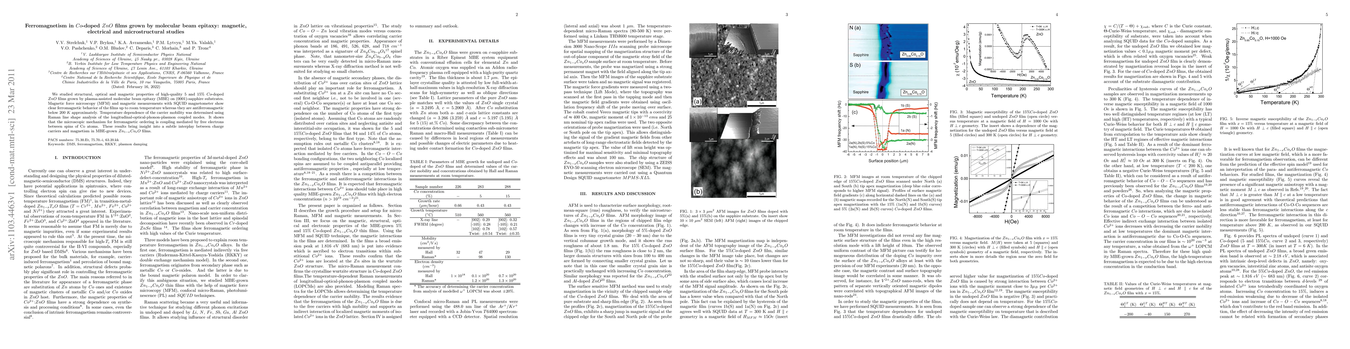 This study investigates Co-doped ZnO films grown via plasma-assisted MBE, revealing ferromagnetic behavior at room temperature due to electron-mediated coupling between Co spins, while antiferromagnetic below 200 K. The research provides insight into the interplay between charge carriers and magnetism in such films.