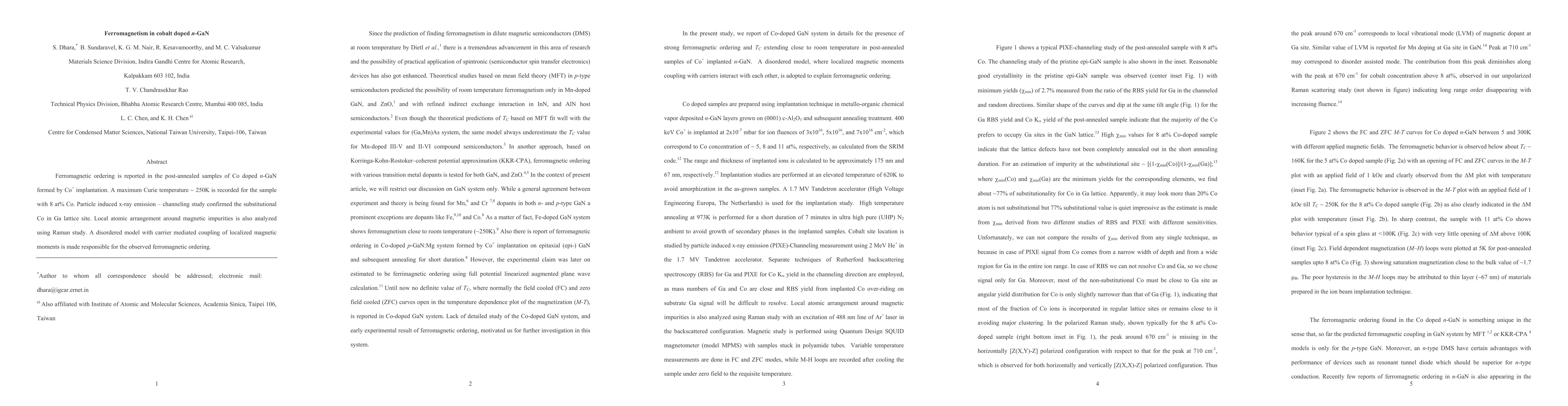 Ferromagnetic ordering is reported in the post-annealed samples of Co doped n-GaN formed by Co+ implantation. A maximum Curie temperature ~ 250K is recorded for the sample with 8 atomic percent Co. Particle induced x-ray emission-channeling study confirmed the substitutional Co in Ga lattice site. Local atomic arrangement around magnetic impurities is also analyzed using Raman study. A disordered model with carrier mediated coupling of localized magnetic moments is made responsible for the observed ferromagnetic ordering.