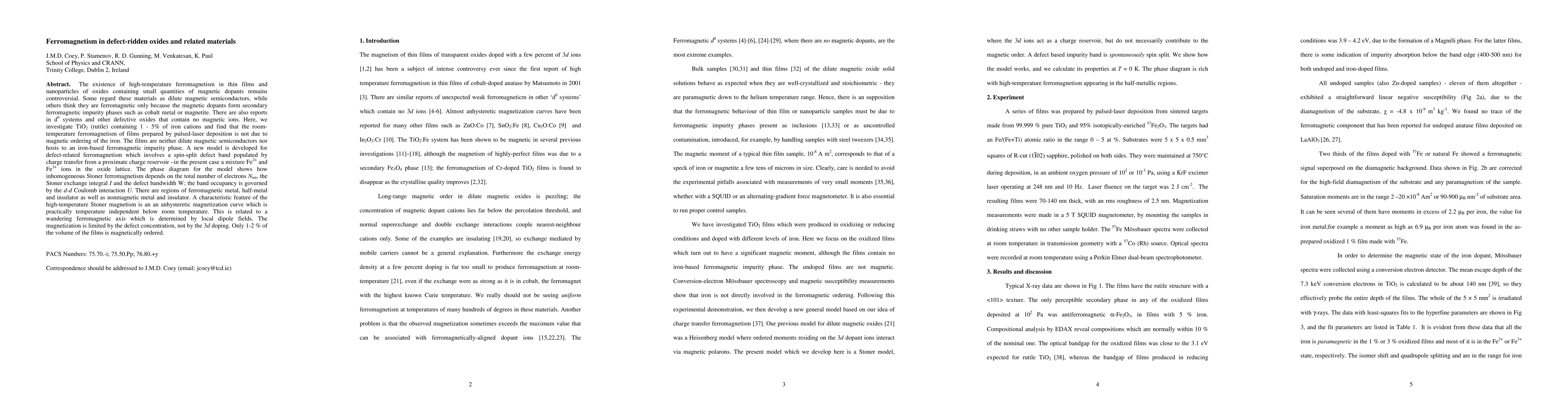 The existence of high-temperature ferromagnetism in thin films and nanoparticles of oxides containing small quantities of magnetic dopants remains controversial. Some regard these materials as dilute magnetic semiconductors, while others think they are ferromagnetic only because the magnetic dopants form secondary ferromagnetic impurity phases such as cobalt metal or magnetite. There are also reports in d0 systems and other defective oxides that contain no magnetic ions. Here, we investigate TiO2 (rutile) containing 1 - 5% of iron cations and find that the room-temperature ferromagnetism of films prepared by pulsed-laser deposition is not due to magnetic ordering of the iron. The films are neither dilute magnetic semiconductors nor hosts to an iron-based ferromagnetic impurity phase. A new model is developed for defect-related ferromagnetism which involves a spin-split defect band populated by charge transfer from a proximate charge reservoir in the present case a mixture Fe2+ and Fe3+ ions in the oxide lattice. The phase diagram for the model shows how inhomogeneous Stoner ferromagnetism depends on the total number of electrons Ntot, the Stoner exchange integral I and the defect bandwidth W; the band occupancy is governed by the d-d Coulomb interaction U. There are regions of ferromagnetic metal, half-metal and insulator as well as nonmagnetic metal and insulator. A characteristic feature of the high-temperature Stoner magnetism is an an anhysteretic magnetization curve which is practically temperature independent below room temperature. This is related to a wandering ferromagnetic axis which is determined by local dipole fields. The magnetization is limited by the defect concentration, not by the 3d doping. Only 1-2 % of the volume of the films is magnetically ordered.