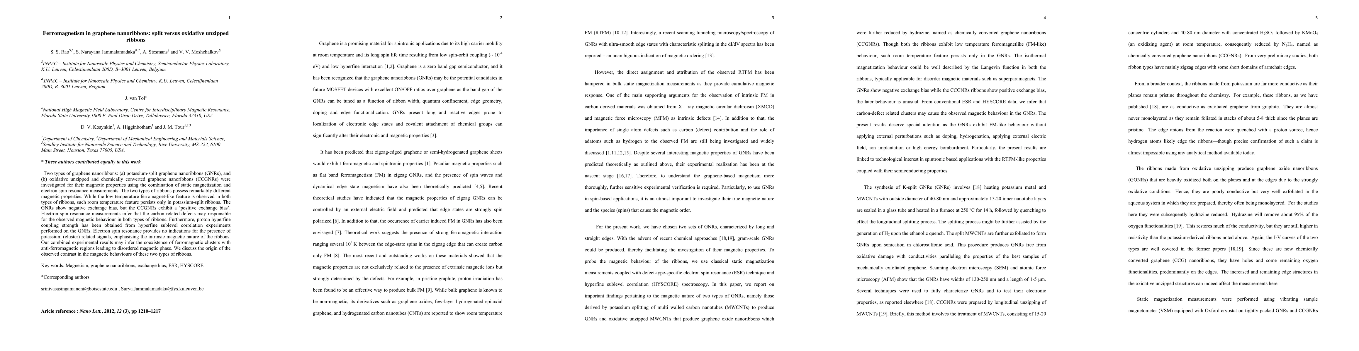 Two types of graphene nanoribbons: (a) potassium-split graphene nanoribbons (GNRs), and (b) oxidative unzipped and chemically converted graphene nanoribbons (CCGNRs) were investigated for their magnetic properties using the combination of static magnetization and electron spin resonance measurements. The two types of ribbons possess remarkably different magnetic properties. While the low temperature ferromagnet-like feature is observed in both types of ribbons, such room temperature feature persists only in potassium-split ribbons. The GNRs show negative exchange bias, but the CCGNRs exhibit a 'positive exchange bias'. Electron spin resonance measurements infer that the carbon related defects may responsible for the observed magnetic behaviour in both types of ribbons. Furthermore, proton hyperfine coupling strength has been obtained from hyperfine sublevel correlation experiments performed on the GNRs. Electron spin resonance provides no indications for the presence of potassium (cluster) related signals, emphasizing the intrinsic magnetic nature of the ribbons. Our combined experimental results may infer the coexistence of ferromagnetic clusters with anti-ferromagnetic regions leading to disordered magnetic phase. We discuss the origin of the observed contrast in the magnetic behaviours of these two types of ribbons.