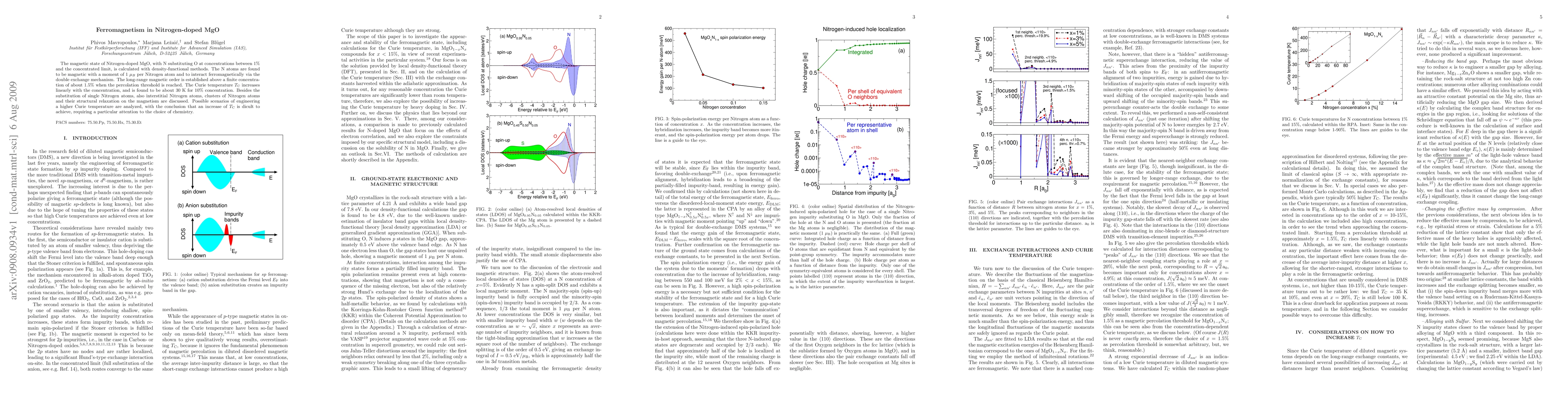 This study uses density-functional methods to calculate magnetic states in Nitrogen-doped MgO. It finds that Nitrogen atoms, substituting O, become magnetic with a 1 Bohr magneton moment each, interacting ferromagnetically above 1.5% concentration, with Curie temperatures linearly increasing to ~30K at 10%. The paper also discusses single and clustered Nitrogen atoms, suggesting that raising Curie temperature requires careful chemistry choice.