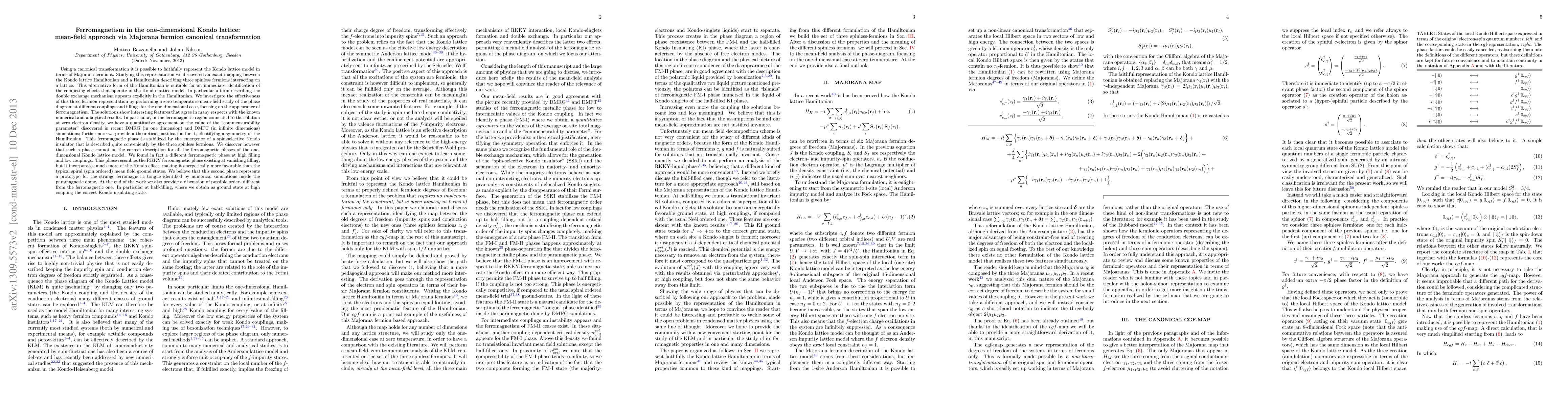 Using a canonical transformation it is possible to faithfully represent the Kondo lattice model in terms of Majorana fermions. Studying this representation we discovered an exact mapping between the Kondo lattice Hamiltonian and a Hamiltonian describing three spinless fermions interacting on a lattice. We investigate the effectiveness of this three fermion representation by performing a zero temperature mean-field study of the phase diagram at different couplings and fillings for the one-dimensional case, focusing on the appearance of ferromagnetism. The solutions agree in many respects with the known numerical and analytical results. In particular, in the ferromagnetic region connected to the solution at zero electron density, we have a quantitative agreement on the value of the commensurability parameter discovered in recent DMRG (in one dimension) and DMFT (in infinite dimensions) simulations; furthermore we provide a theoretical justification for it, identifying a symmetry of the Hamiltonian. This ferromagnetic phase is stabilized by the emergence of a spin-selective Kondo insulator that is described quite conveniently by the three spinless fermions. We discovered also a different ferromagnetic phase at high filling and low couplings. This phase resembles the RKKY ferromagnetic phase existing at vanishing filling, but it incorporates much more of the Kondo effect, making it energetically more favorable than the typical spiral (spin ordered) mean field ground states. We believe that this second phase represents a prototype for the strange ferromagnetic tongue identified by numerical simulations inside the paramagnetic dome. At the end of the work we also provide a discussion of possible orders different from the ferromagnetic one. In particular at half-filling, where we obtain as ground state at high coupling the correct Kondo insulating state.