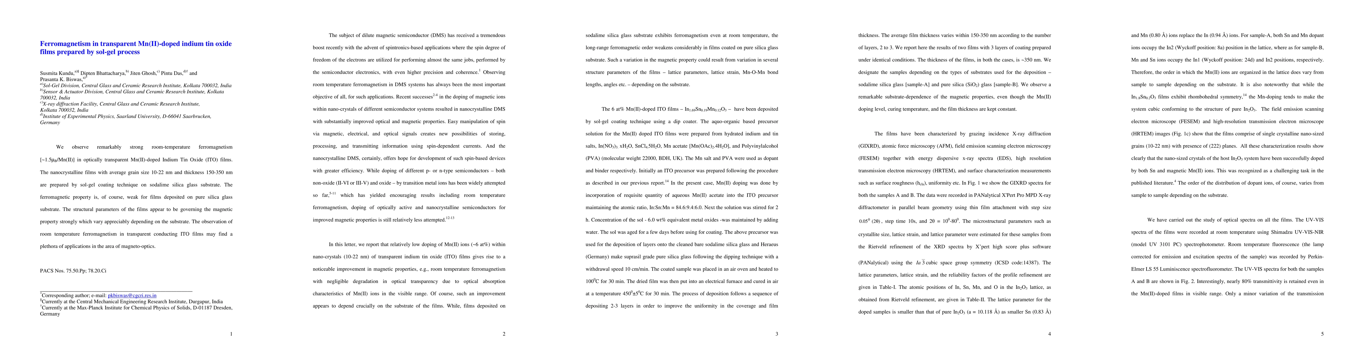 This study reports strong room temperature ferromagnetism in transparent Mn(II)-doped indium tin oxide films prepared via sol-gel process, with significant magnetic properties influenced by substrate type. Potential applications in magneto-optics are suggested.