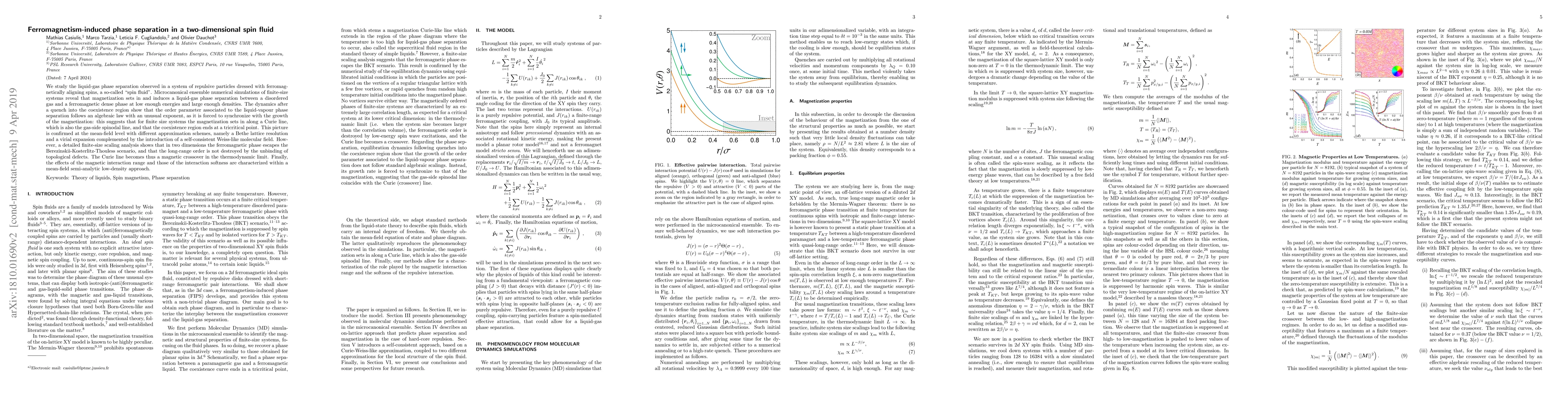 We study the liquid-gas phase separation observed in a system of repulsive particles dressed with ferromagnetically aligning spins, a so-called `spin fluid'. Microcanonical ensemble numerical simulations of finite-size systems reveal that magnetization sets in and induces a liquid-gas phase separation between a disordered gas and a ferromagnetic dense phase at low enough energies and large enough densities. The dynamics after a quench into the coexistence region show that the order parameter associated to the liquid-vapour phase separation follows an algebraic law with an unusual exponent, as it is forced to synchronize with the growth of the magnetization: this suggests that for finite size systems the magnetization sets in along a Curie line, which is also the gas-side spinodal line, and that the coexistence region ends at a tricritical point. This picture is confirmed at the mean-field level with different approximation schemes, namely a Bethe lattice resolution and a virial expansion complemented by the introduction of a self-consistent Weiss-like molecular field. However, a detailed finite-size scaling analysis shows that in two dimensions the ferromagnetic phase escapes the Berezinskii-Kosterlitz-Thouless scenario, and that the long-range order is not destroyed by the unbinding of topological defects. The Curie line becomes thus a magnetic crossover in the thermodynamic limit. Finally, the effects of the magnetic interaction range and those of the interaction softness are characterized within a mean-field semi-analytic low-density approach.