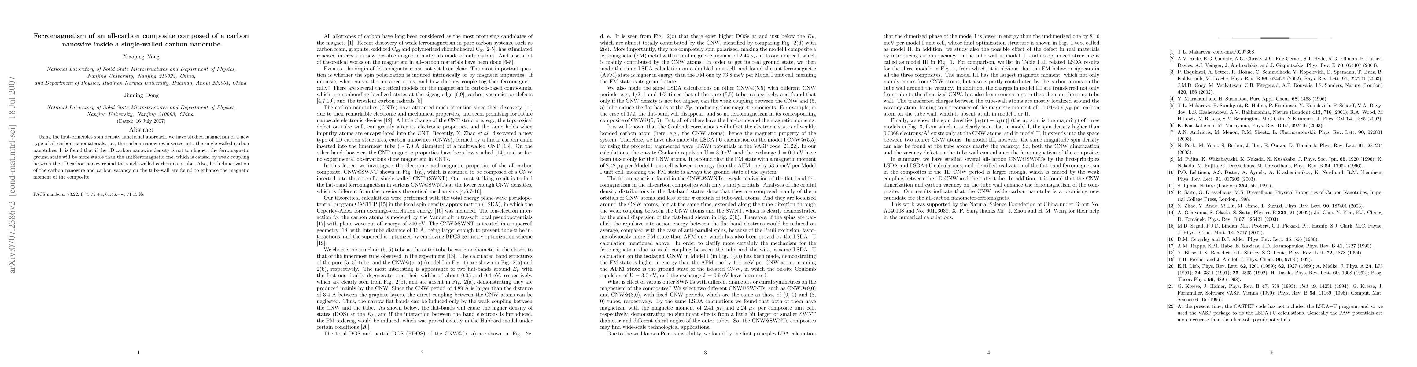 Summary: Researchers utilized first-principles calculations to investigate the magnetism of all-carbon composites comprising carbon nanowires within single-walled carbon nanotubes. They found that under certain conditions, the composite exhibits a stable ferromagnetic ground state due to weak coupling between the components, with enhancements in magnetic moment observed through carbon nanowire dimerization and carbon vacancy defects.