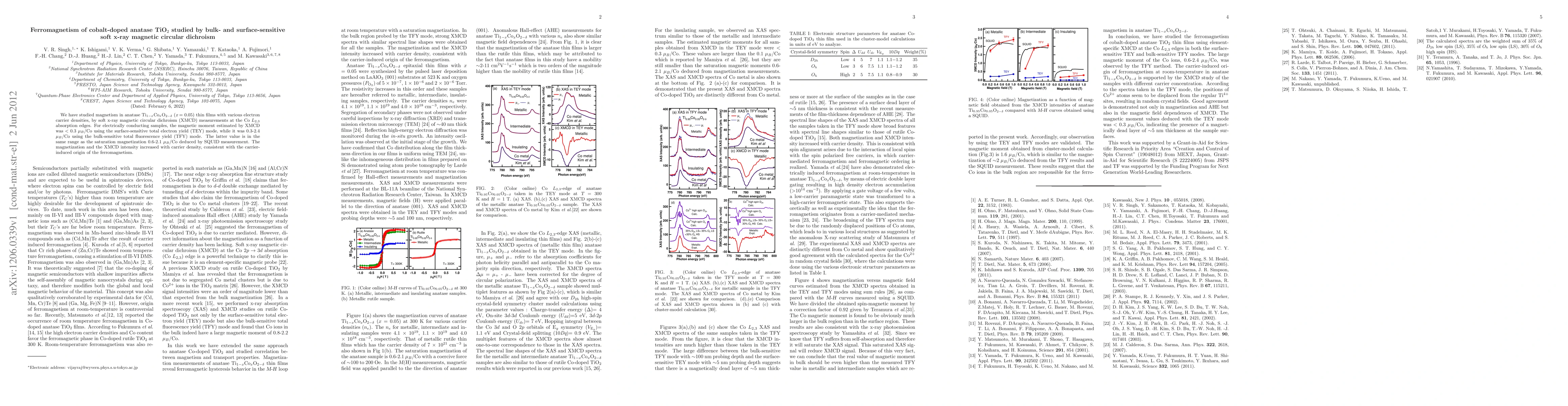 This study investigates the ferromagnetism in cobalt-doped anatase TiO$_2$ thin films using soft x-ray magnetic circular dichroism. The magnetic moment varies from < 0.3 $\mu_B$/Co (surface-sensitive) to 0.3-2.4 $\mu_B$/Co (bulk-sensitive), with the latter aligning with SQUID measurements, indicating carrier-induced ferromagnetism.
