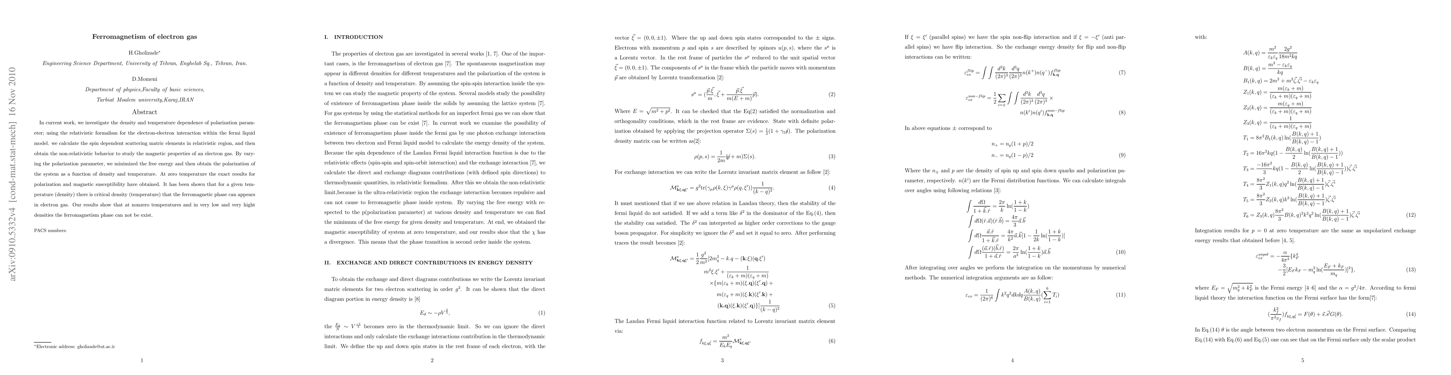 In current work, we investigate the density and temperature dependence of polarization parameter; using the relativistic formalism for the electron-electron interaction within the Fermi liquid model. we calculate the spin dependent scattering matrix elements in relativistic region, and then obtain the non-relativistic behavior to study the magnetic properties of an electron gas. By varying the polarization parameter, we minimized the free energy and then obtain the polarization of the system as a function of density and temperature. At zero temperature the exact results for polarization and magnetic susceptibility have obtained. It has been shown that for a given temperature (density) there is critical density (temperature) that the ferromagnetic phase can appears in electron gas. Our results show that at nonzero temperatures and in very low and very high densities the ferromagnetism phase can not be exist.