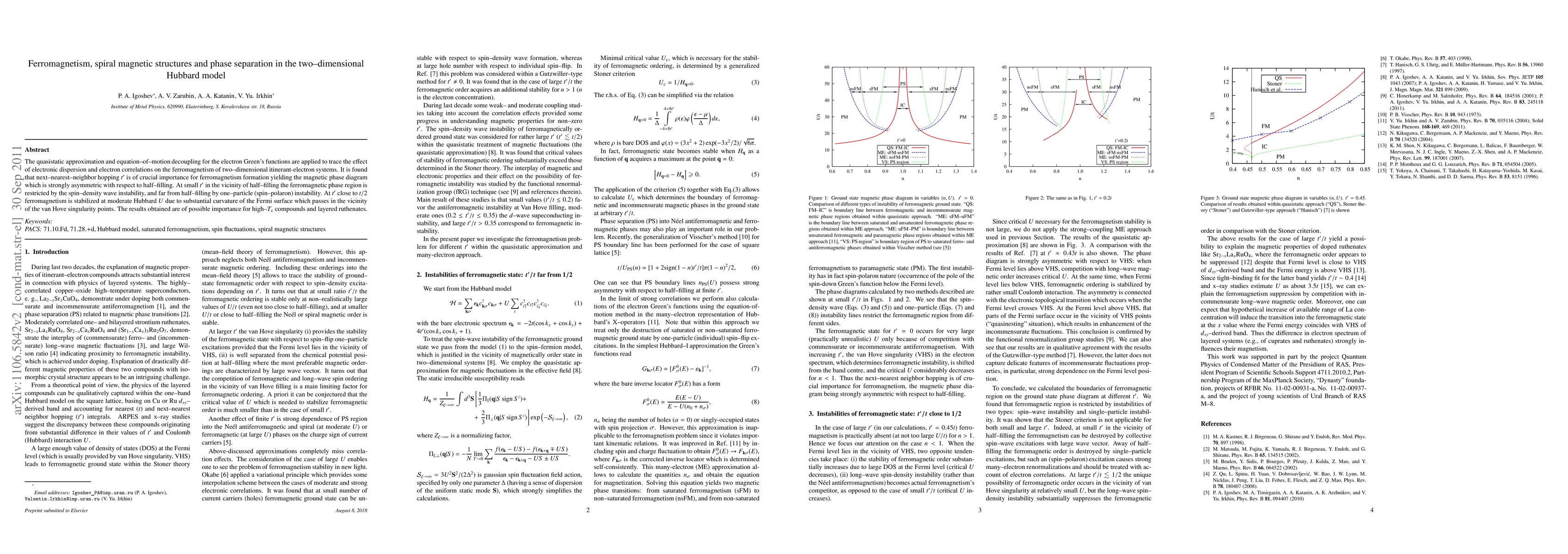 The quasistatic approximation and equation-of-motion decoupling for the electron Green's functions are applied to trace the effect of electronic dispersion and electron correlations on the ferromagnetism of two-dimensional itinerant-electron systems. It is found that next-nearest-neighbor hopping t' is of crucial importance for ferromagnetism formation yielding the magnetic phase diagram which is strongly asymmetric with respect to half-filling. At small t' in the vicinity of half-filling the ferromagnetic phase region is restricted by the spin-density wave instability, and far from half-filling by one-particle (spin-polaron) instability. At t' close to t/2 ferromagnetism is stabilized at moderate Hubbard U due to substantial curvature of the Fermi surface which passes in the vicinity of the van Hove singularity points. The results obtained are of possible importance for high-T_c compounds and layered ruthenates.