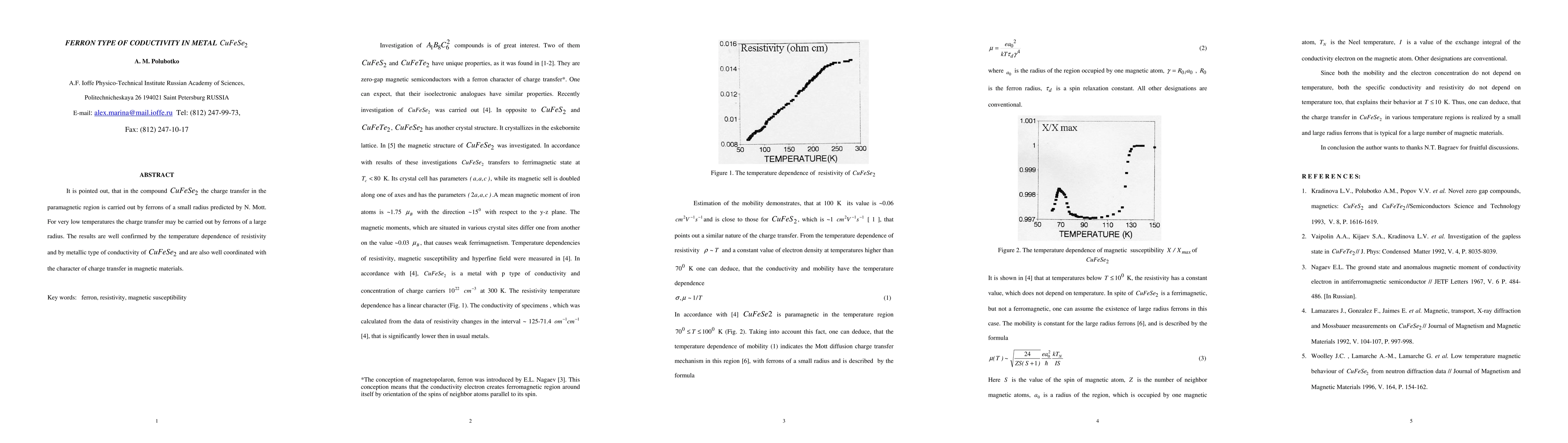 It is pointed out, that the charge transfer in the compound in paramagnetic region has a ferron type of transport with ferrons of a small radius, predicted by N. Mott. For some another specimen the charge transfer may be carried out by ferrons of a large radius at very low temperatures. The results are well confirmed by the temperature dependence of resistivity and by metal type of the compound.