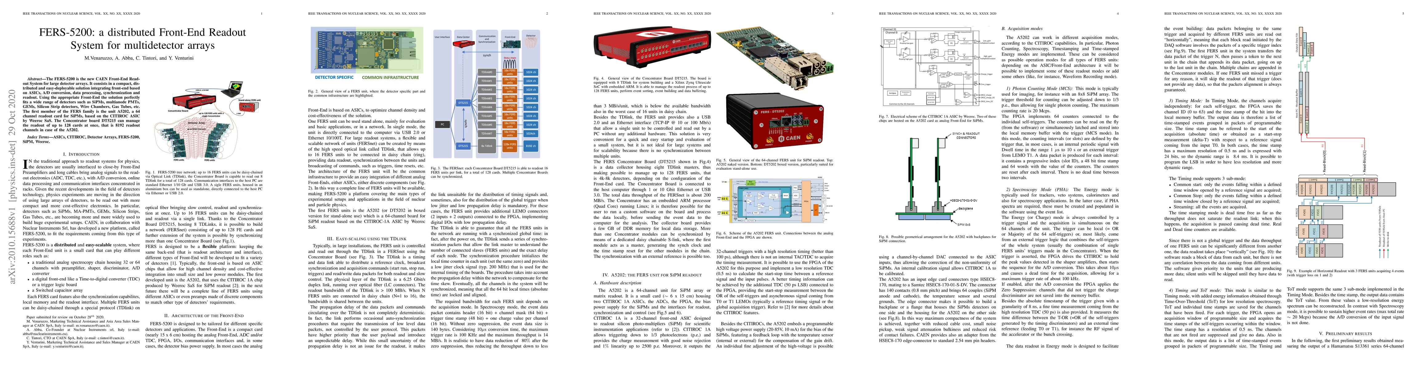 The FERS-5200 is a compact, distributed front-end readout system for large detector arrays, integrating ASICs, A/D conversion, and data processing. The first unit, A5202, supports 64 channels for SiPMs, and the Concentrator board DT5215 can manage up to 128 such cards.