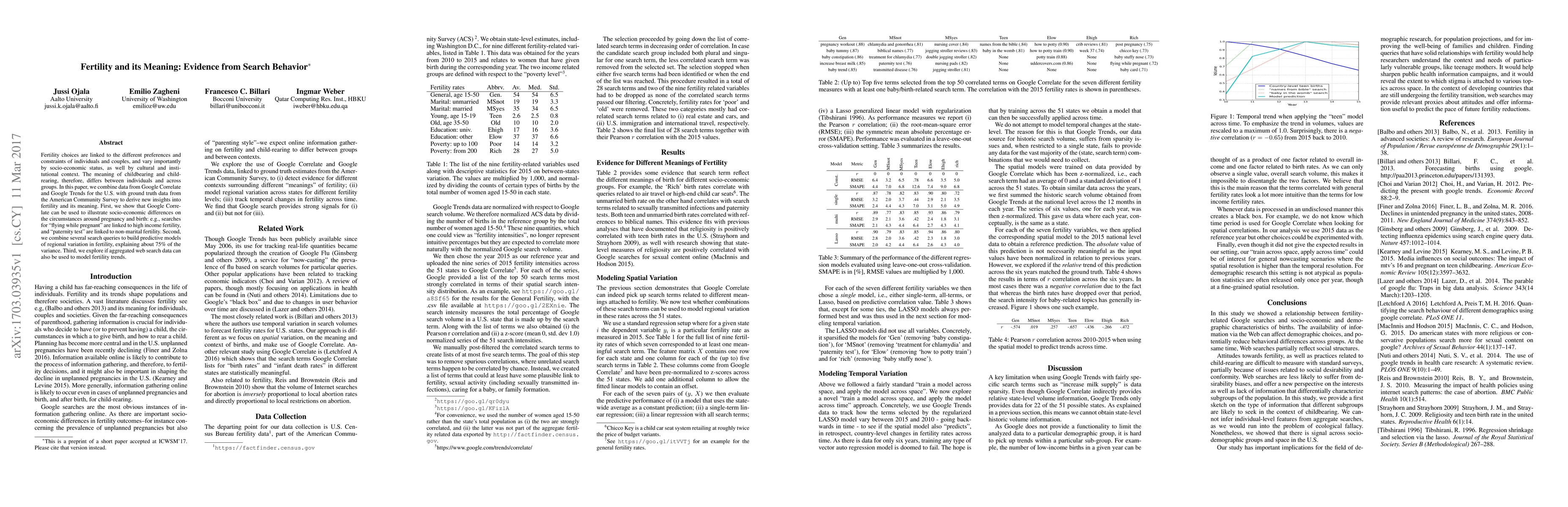 Fertility choices are linked to the different preferences and constraints of individuals and couples, and vary importantly by socio-economic status, as well by cultural and institutional context. The meaning of childbearing and child-rearing, therefore, differs between individuals and across groups. In this paper, we combine data from Google Correlate and Google Trends for the U.S. with ground truth data from the American Community Survey to derive new insights into fertility and its meaning. First, we show that Google Correlate can be used to illustrate socio-economic differences on the circumstances around pregnancy and birth: e.g., searches for "flying while pregnant" are linked to high income fertility, and "paternity test" are linked to non-marital fertility. Second, we combine several search queries to build predictive models of regional variation in fertility, explaining about 75% of the variance. Third, we explore if aggregated web search data can also be used to model fertility trends.