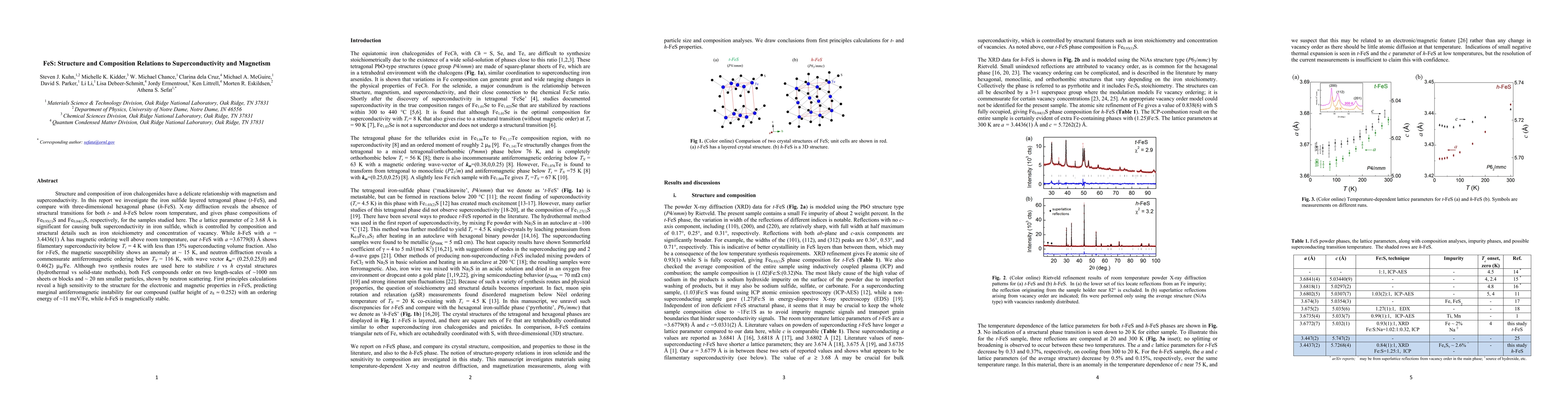 This study investigates the structural and compositional relationships of iron sulfide phases (t-FeS and h-FeS) with magnetism and superconductivity. While h-FeS exhibits magnetic ordering above room temperature, t-FeS shows filamentary superconductivity below 4 K and antiferromagnetic ordering below 116 K, highlighting the significant influence of lattice parameters and composition on these properties.