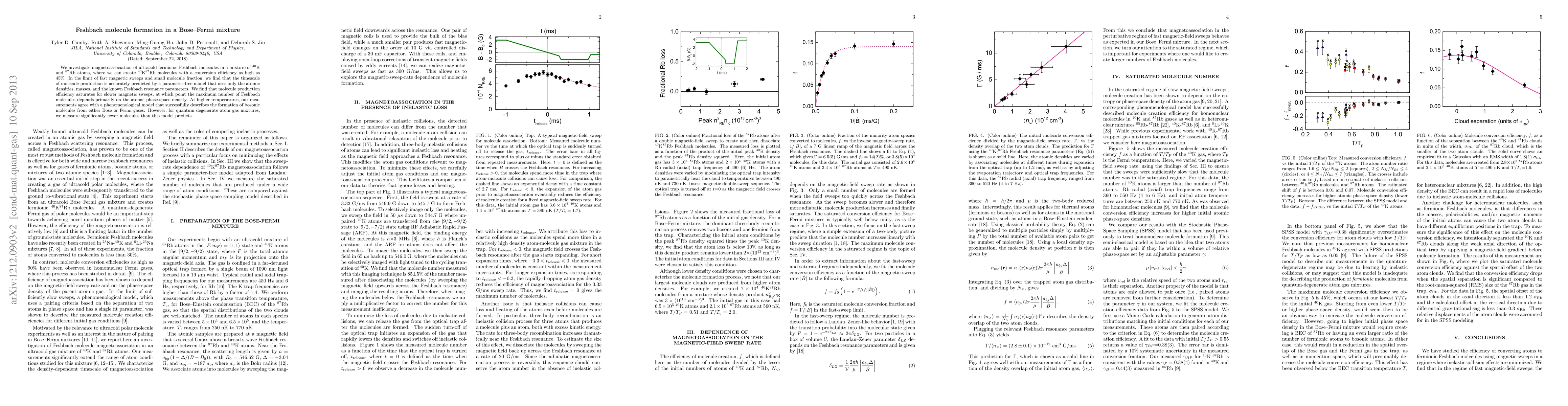 We investigate magnetoassociation of ultracold fermionic Feshbach molecules in a mixture of $^{40}$K and $^{87}$Rb atoms, where we can create as many as $7\times 10^4$ $^{40}$K$^{87}$Rb molecules with a conversion efficiency as high as 45%. In the perturbative regime, we find that the conversion efficiency depends linearly on the density overlap of the two gases, with a slope that matches a parameter-free model that uses only the atom masses and the known Feshbach resonance parameters. In the saturated regime, we find that the maximum number of Feshbach molecules depends on the atoms' phase-space density. At higher temperatures, our measurements agree with a phenomenological model that successfully describes the formation of bosonic molecules from either Bose or Fermi gases. However, for quantum degenerate atom gas mixtures, we measure significantly fewer molecules than this model predicts.