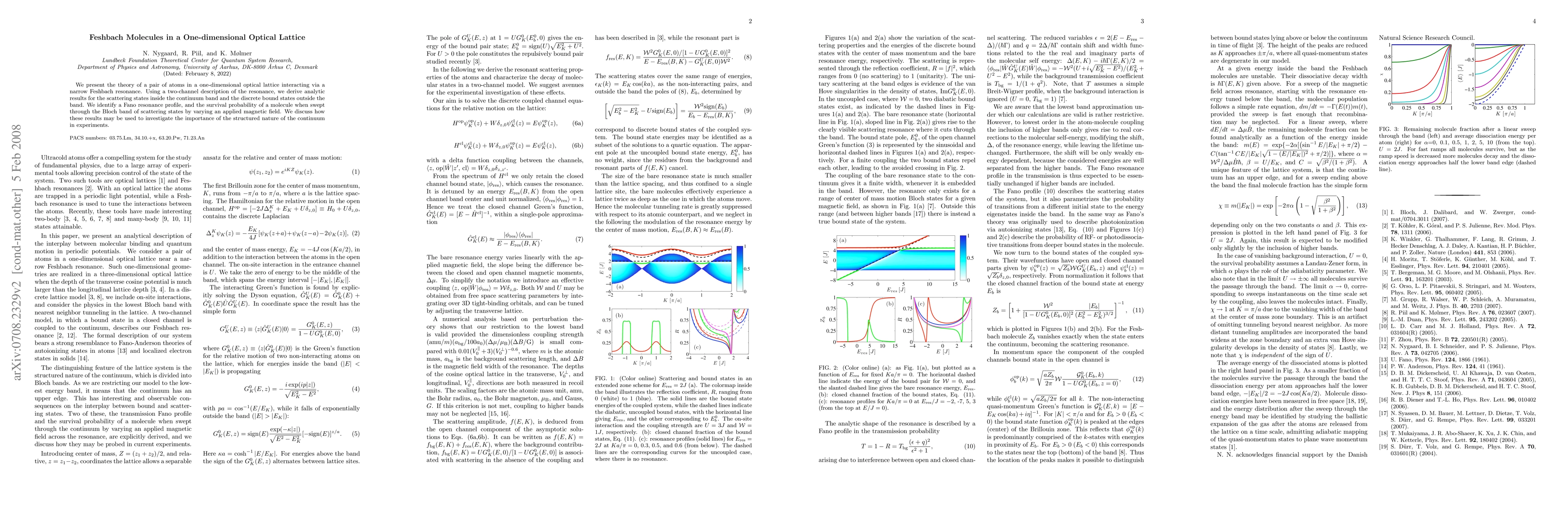 We present the theory of a pair of atoms in a one-dimensional optical lattice interacting via a narrow Feshbach resonance. Using a two-channel description of the resonance, we derive analytic results for the scattering states inside the continuum band and the discrete bound states outside the band. We identify a Fano resonance profile, and the survival probability of a molecule when swept through the Bloch band of scattering states by varying an applied magnetic field. We discuss how these results may be used to investigate the importance of the structured nature of the continuum in experiments.
