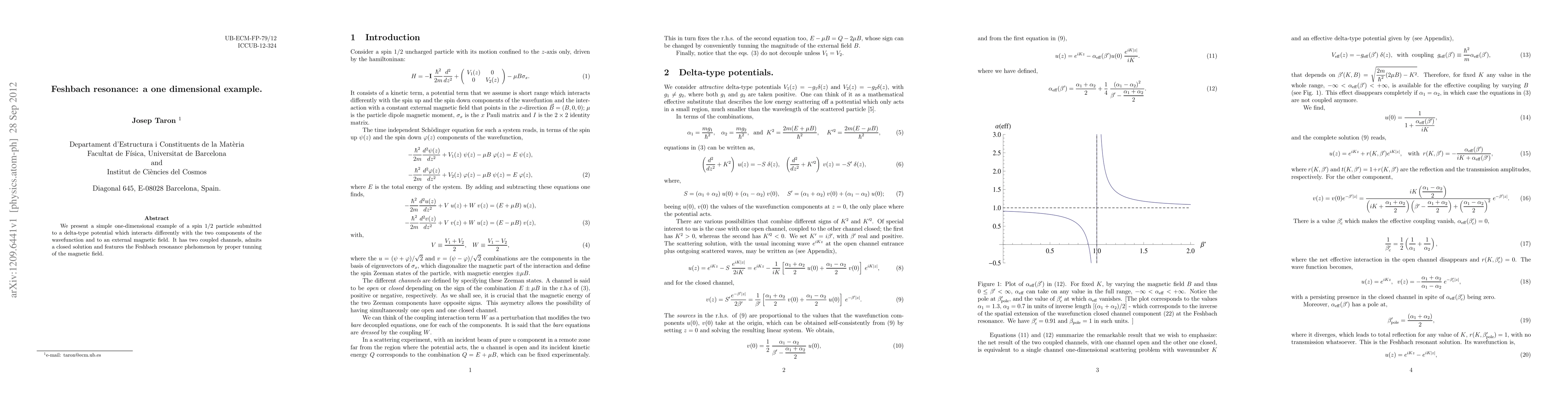 We present a simple one-dimensional example of a spin 1/2 particle submitted to a delta-type potential which interacs differently with the two components of the wavefunction and to an external magnetic field. It has two coupled channels, admits a closed solution and features the Feshbach resonance phenomenon by proper tunning of the magnetic field.