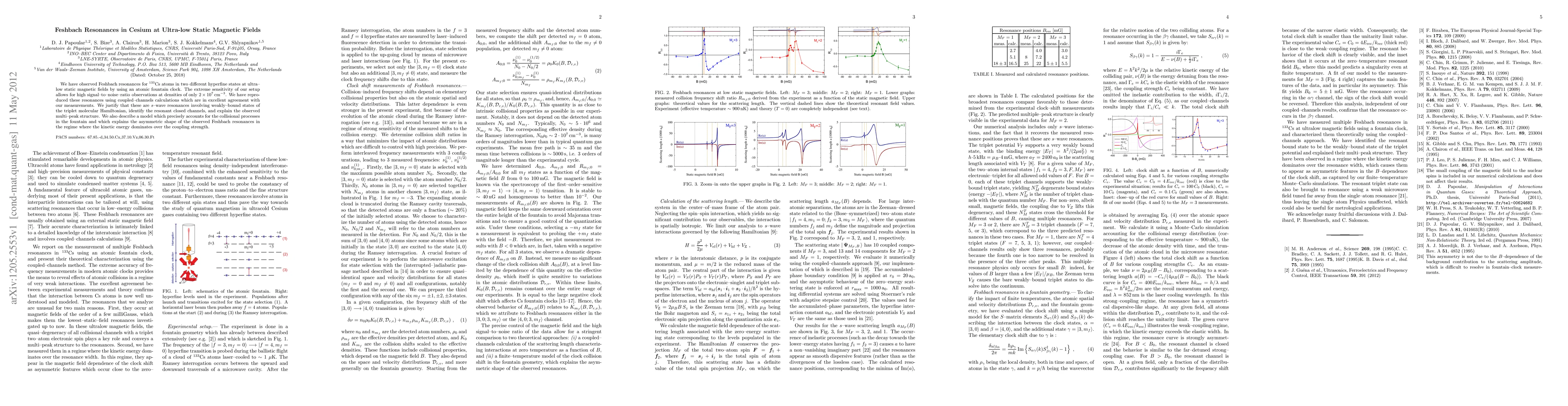 Researchers observed Feshbach resonances in cesium atoms at ultra-low magnetic fields using an atomic fountain clock, reproducing the findings with coupled-channels calculations.