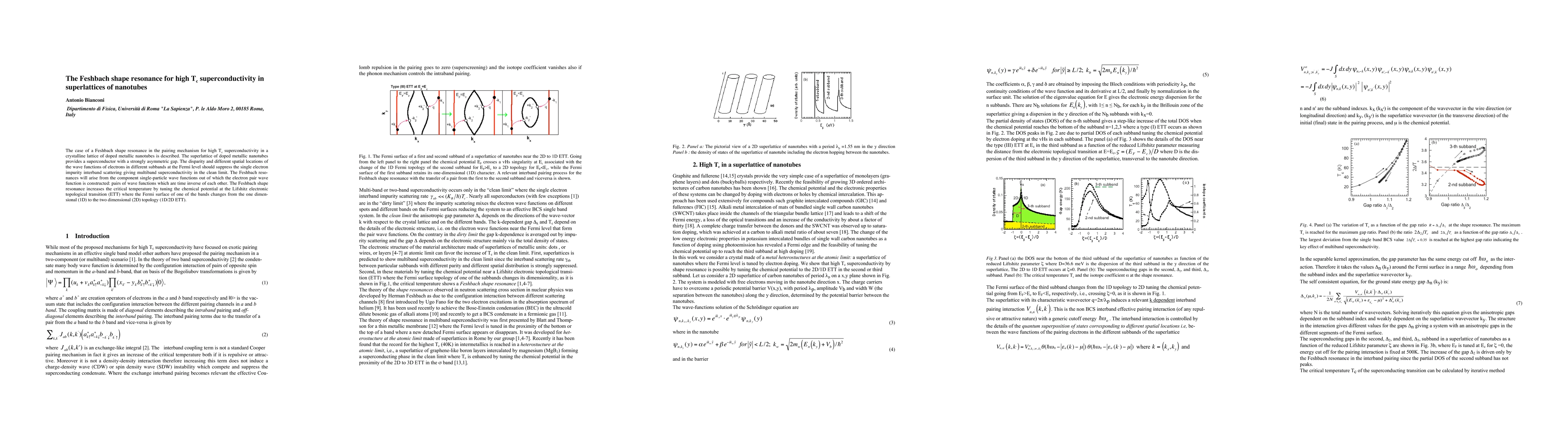 The case of a Feshbach shape resonance in the pairing mechanism for high T c superconductivity in a crystalline lattice of doped metallic nanotubes is described. The superlattice of doped metallic nanotubes provides a superconductor with a strongly asymmetric gap. The disparity and different spatial locations of the wave functions of electrons in different subbands at the Fermi level should suppress the single electron impurity interband scattering giving multiband superconductivity in the clean limit. The Feshbach resonances will arise from the component single-particle wave functions out of which the electron pair wave function is constructed: pairs of wave functions which are time inverse of each other. The Feshbach shape resonance increases the critical temperature by tuning the chemical potential at the Lifshitz electronic topological transition (ETT) where the Fermi surface of one of the bands changes from the one dimensional (1D) to the two dimensional (2D) topology (1D/2D ETT).