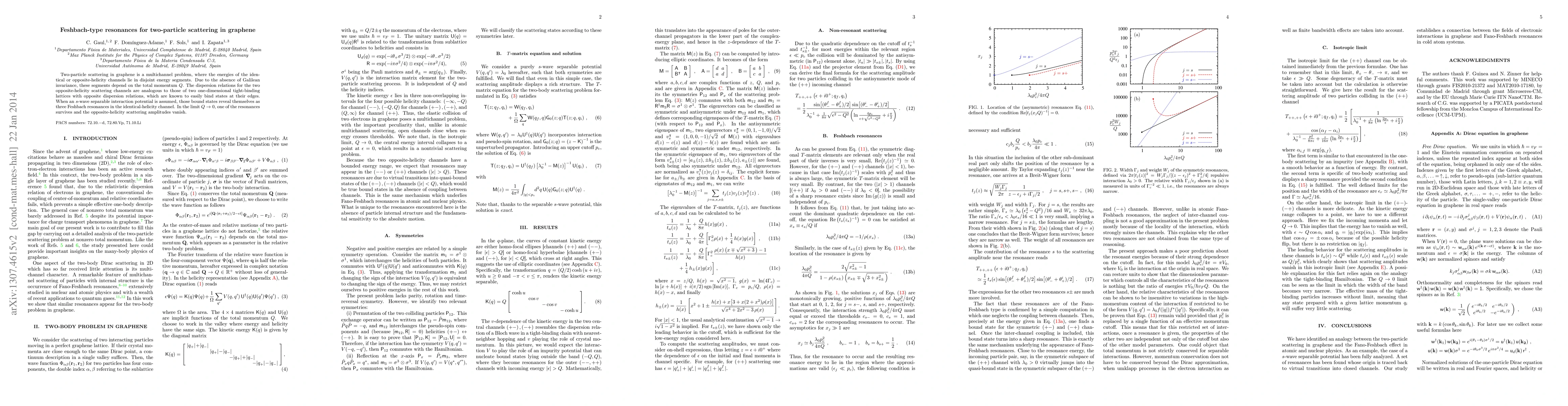 Two-particle scattering in graphene is a multichannel problem, where the energies of the identical or opposite-helicity channels lie in disjoint energy segments. Due to the absence of Galilean invariance, these segments depend on the total momentum $Q$. The dispersion relations for the two opposite-helicity scattering channels are analogous to those of two one-dimensional tight-binding lattices with opposite dispersion relations, which are known to easily bind states at their edges. When an $s$-wave separable interaction potential is assumed, those bound states reveal themselves as three Feshbach resonances in the identical-helicity channel. In the limit $Q \rightarrow 0$, one of the resonances survives and the opposite-helicity scattering amplitudes vanish.
