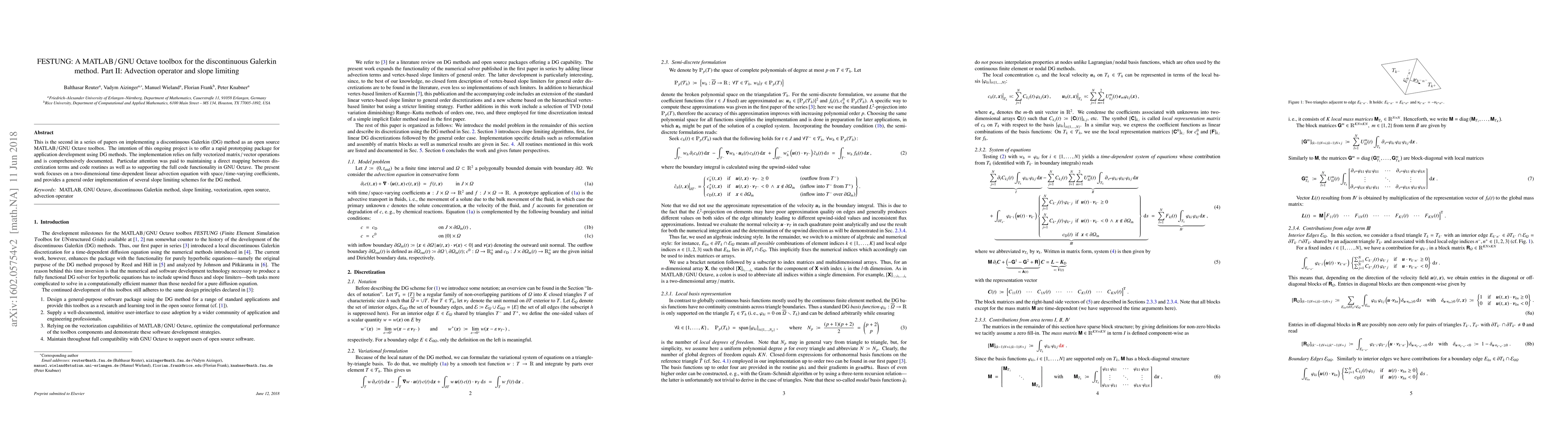This paper presents the second part of an open-source MATLAB/GNU Octave toolbox for the discontinuous Galerkin method, focusing on the implementation of a two-dimensional advection operator and slope limiting schemes to enhance numerical stability. The toolbox emphasizes vectorized operations and full GNU Octave compatibility.