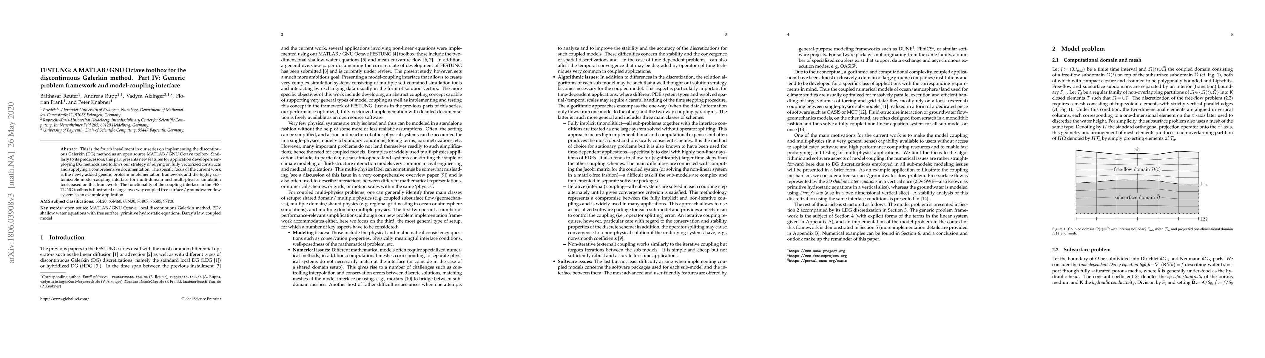 This paper introduces a new framework in the FESTUNG toolbox for implementing the discontinuous Galerkin method, featuring a generic problem implementation and a customizable model-coupling interface for multi-domain and multi-physics simulations, demonstrated through a coupled free-surface/groundwater flow example.