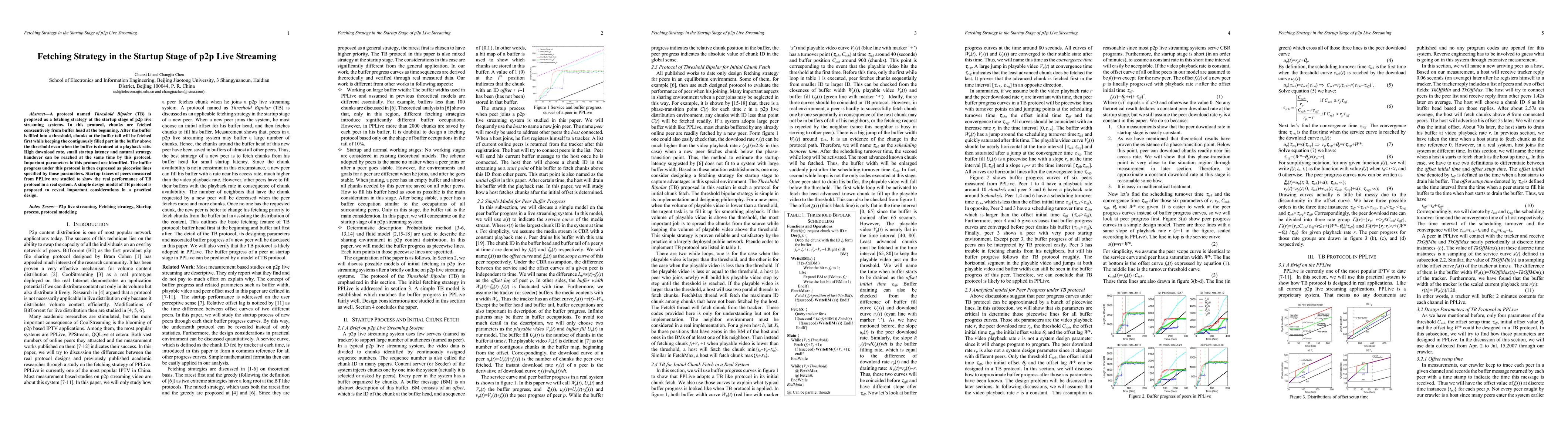 The paper proposes a Threshold Bipolar (TB) protocol for fetching chunks in p2p live streaming at startup, balancing high download rates, low latency, and smooth strategy transitions. The protocol's performance is validated through analysis of real-world startup traces from PPLive and a proposed design model.