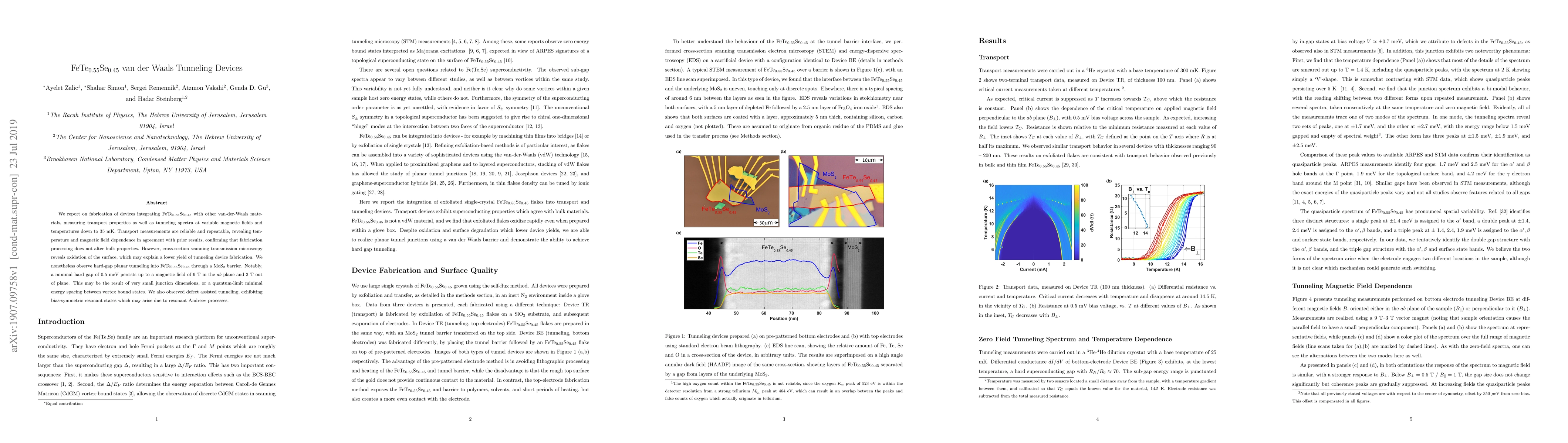 We report on fabrication of devices integrating FeTe$_{0.55}$Se$_{0.45}$ with other van-der-Waals materials, measuring transport properties as well as tunneling spectra at variable magnetic fields and temperatures down to 35 mK. Transport measurements are reliable and repeatable, revealing temperature and magnetic field dependence in agreement with prior results, confirming that fabrication processing does not alter bulk properties. However, cross-section scanning transmission microscopy reveals oxidation of the surface, which may explain a lower yield of tunneling device fabrication. We nonetheless observe hard-gap planar tunneling into FeTe$_{0.55}$Se$_{0.45}$ through a MoS$_2$ barrier. Notably, a minimal hard gap of 0.5 meV persists up to a magnetic field of 9 T in the $ab$ plane and 3 T out of plane. This may be the result of very small junction dimensions, or a quantum-limit minimal energy spacing between vortex bound states. We also observed defect assisted tunneling, exhibiting bias-symmetric resonant states which may arise due to resonant Andreev processes.